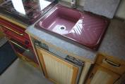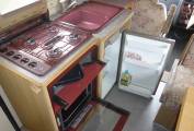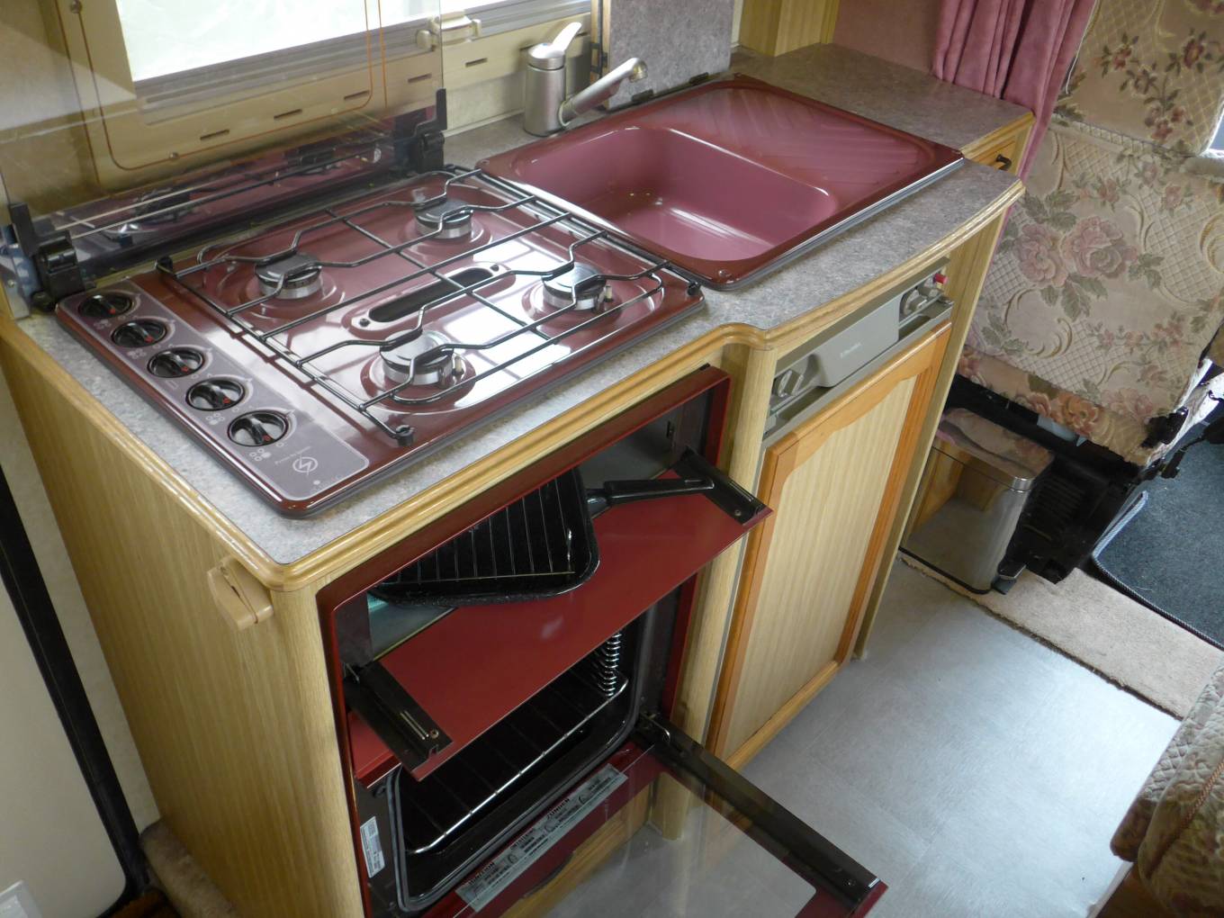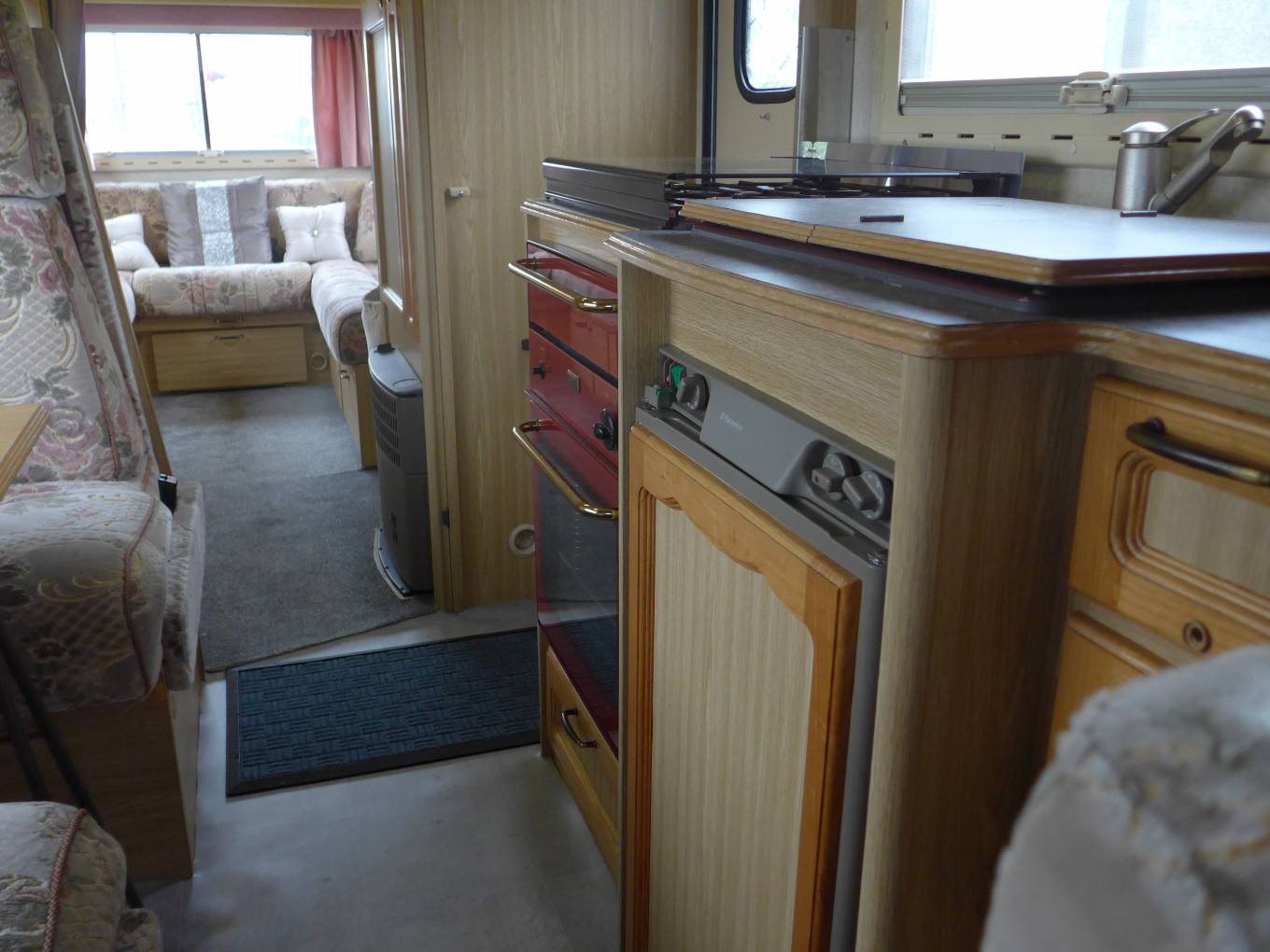Side kitchen with full cooker comprising oven with grill, 4 burner gas hob. Sink and 3-way fridge.
