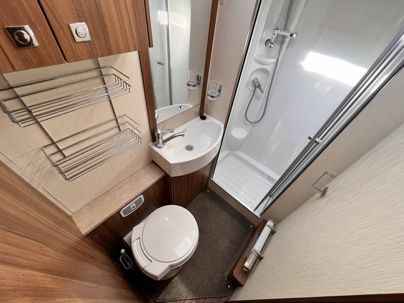 Here you will find a Thetford Cassette Flush Toilet, a Wash Handbasin and a separate Shower Cubicle.