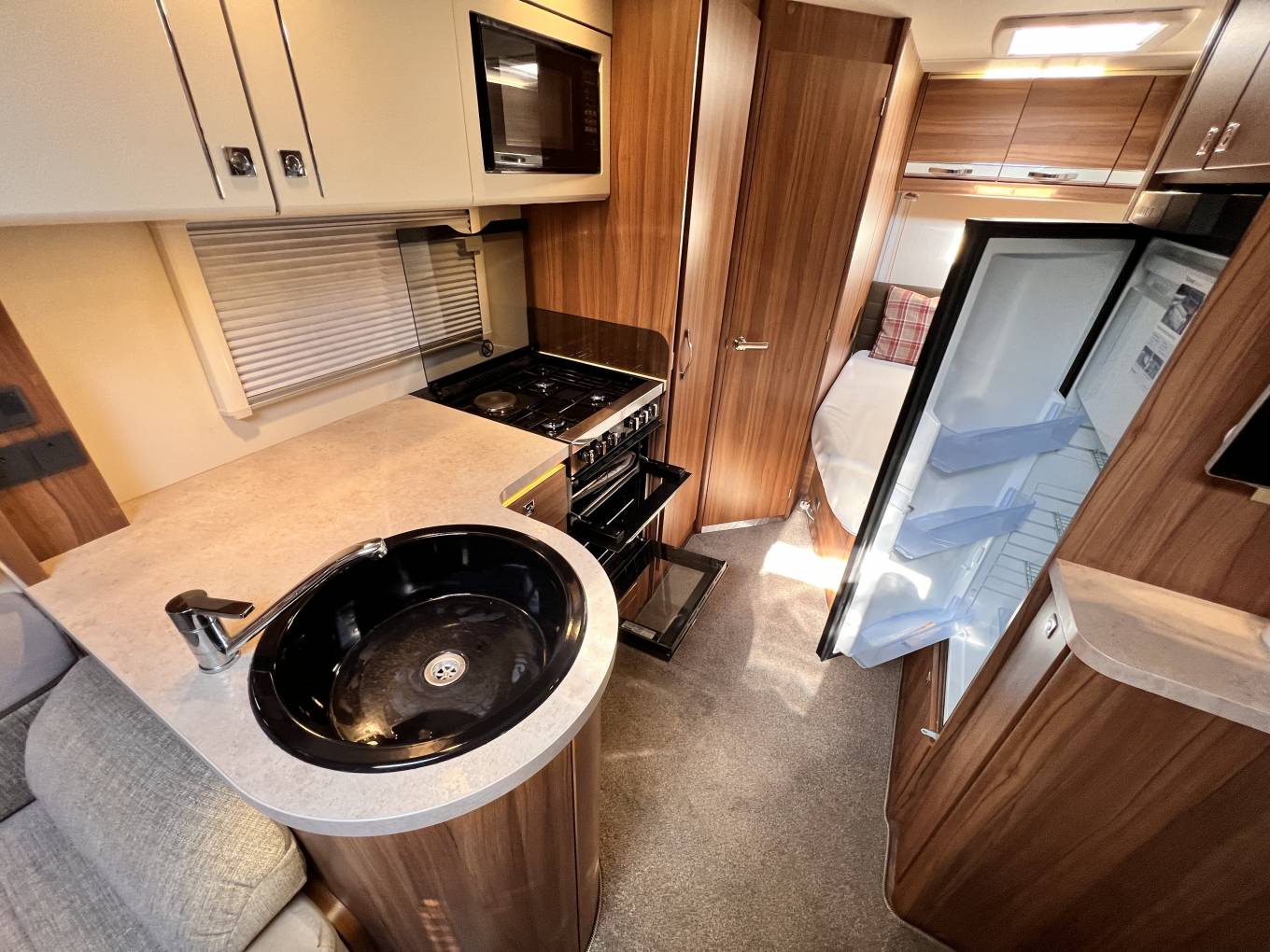 Across the centre of the motorhome is the extensively equipped kitchen consisting of a three gas burner and one electric hotplate hob, a separate Grill and Oven, a large Dometic three energy source Fridge Freezer, a Microwave Oven, a Sink with a Hot and Cold mixer tap plus plenty of cupboard space and worktop area.