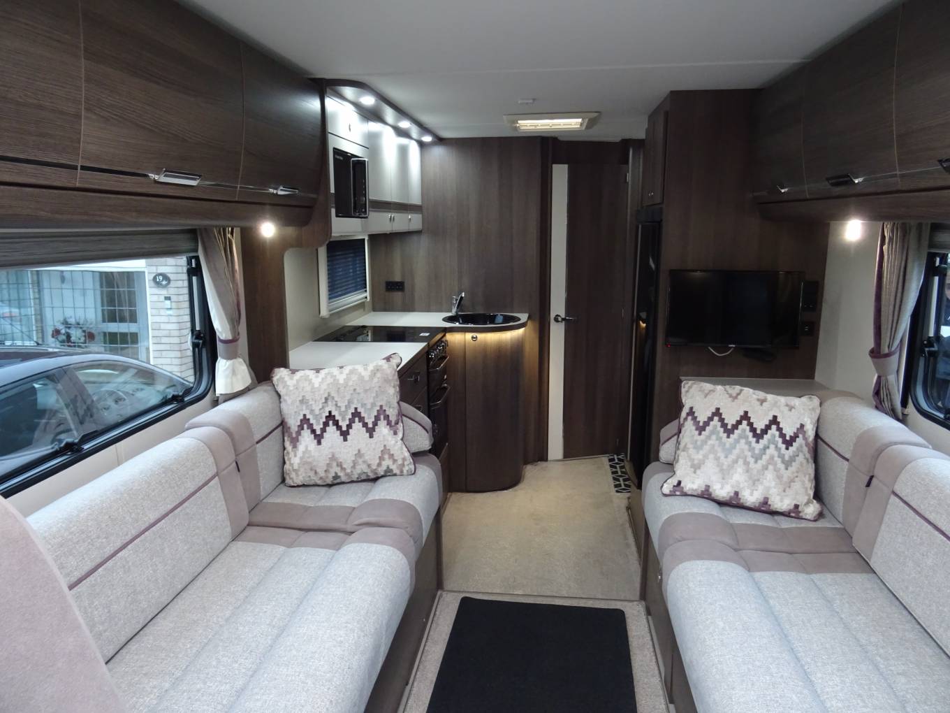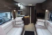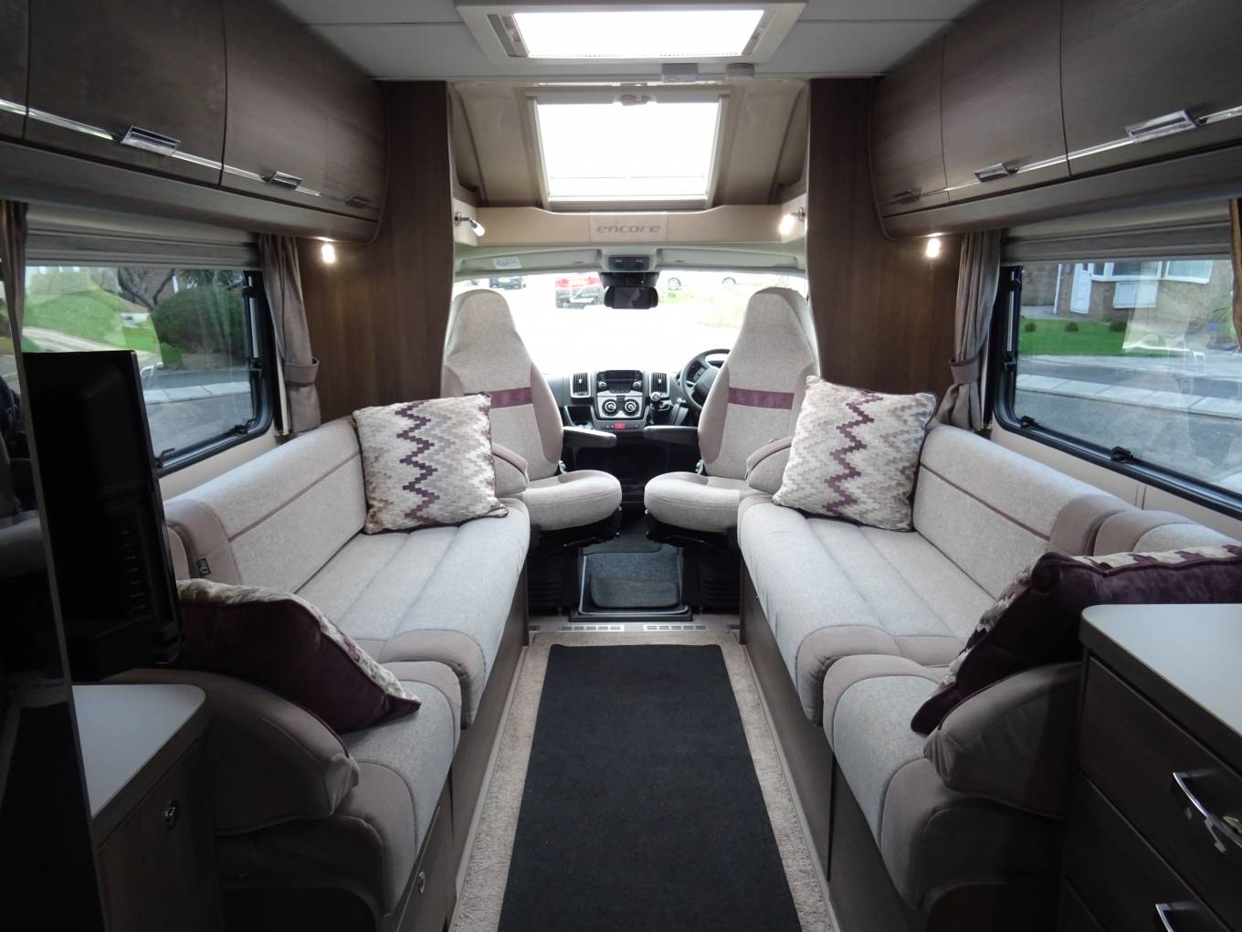 Located behind the cab are two opposing side sofas that create a
