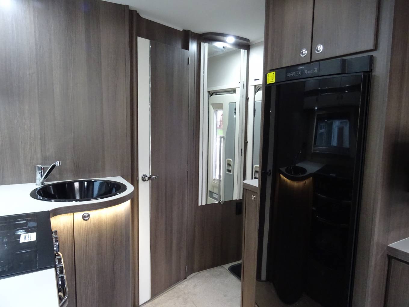 a sink. Opposite is a large fridge with a freezer compartment. At the rear of