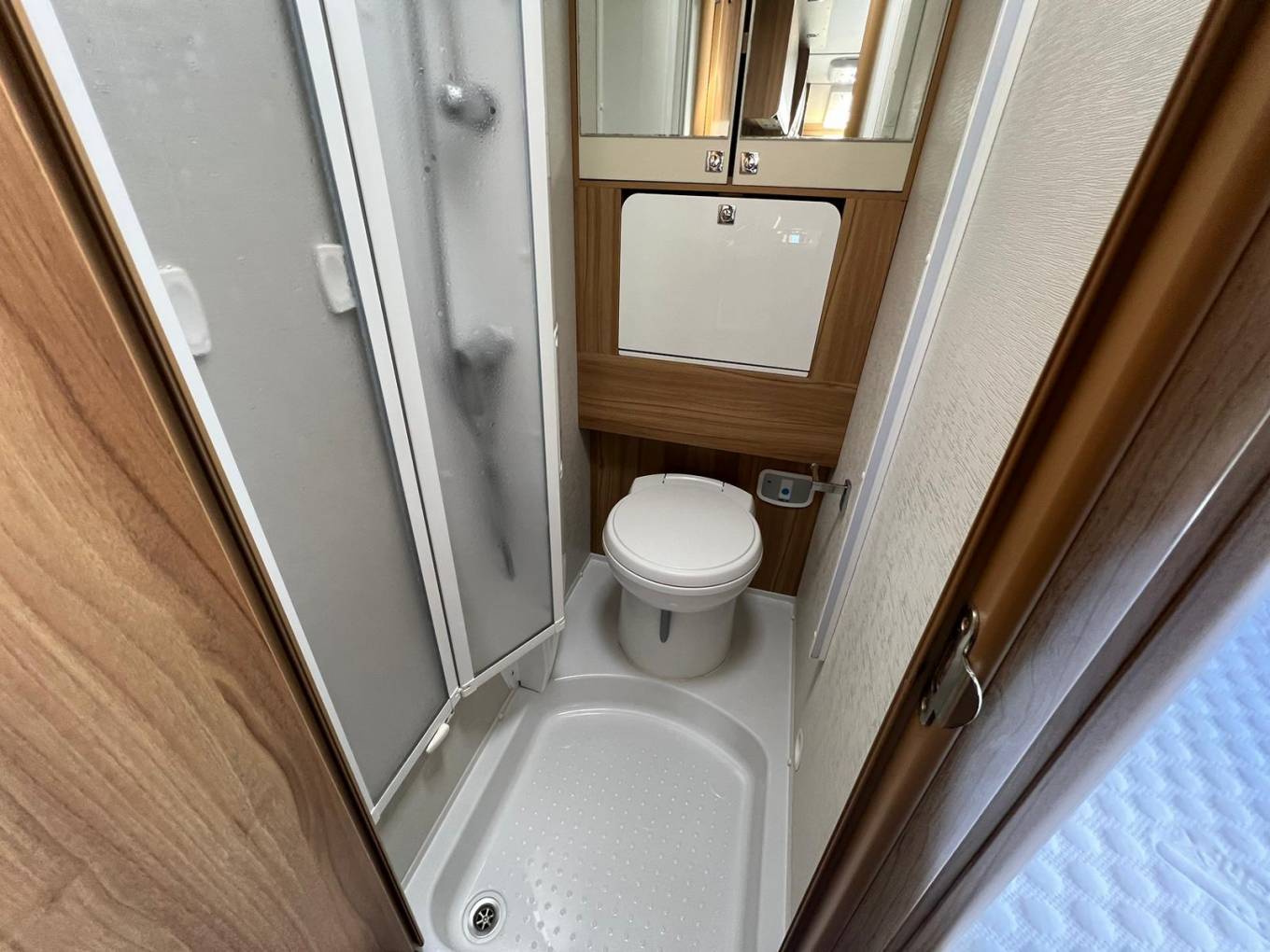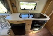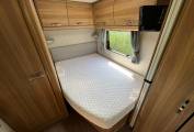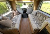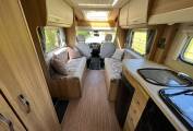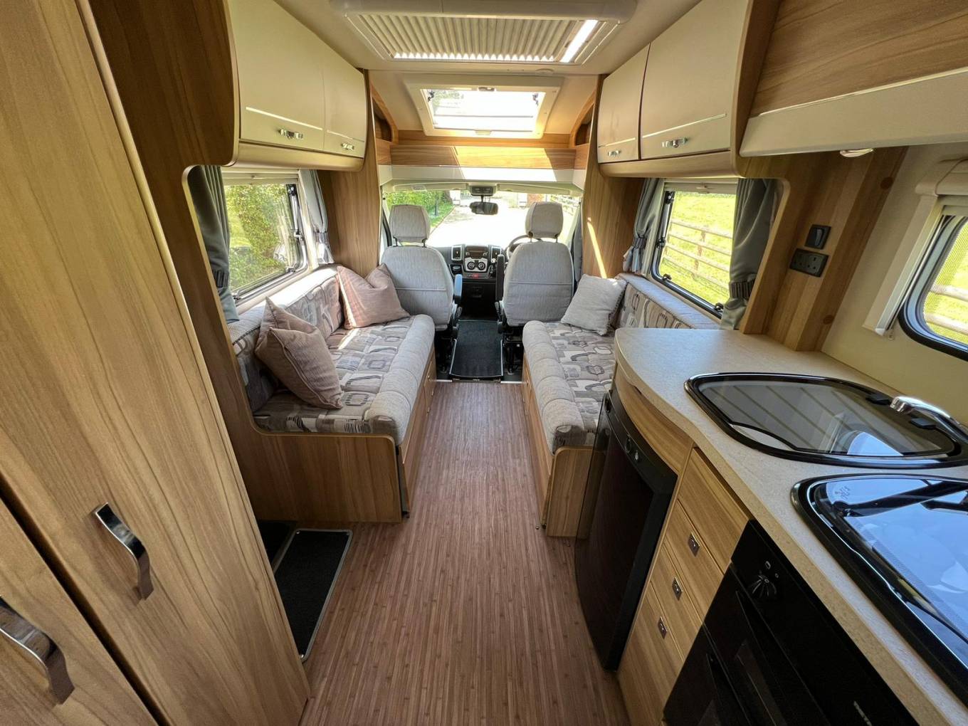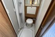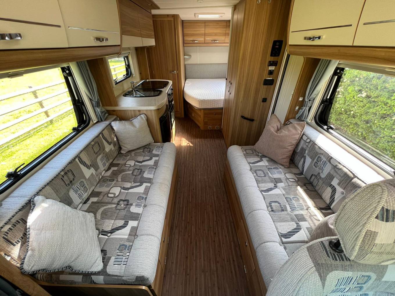 Firstly, we start at the rear fixed comfortable double bed. Where you will find ample storage in lockers above and below. Adjacent is the washroom, complete with shower, toilet and wash basin. Next, we are greeted by a well equipped kitchen. Which includes an oven, grill, wash basin, gas hob and 3 way fridge. To the front is the dinette area which is the perfect place to relax. When the night draws in the dinette converts to a comfortable double bed. The dinette also features 2 fold away seats under the benches with 3 point seat belts.