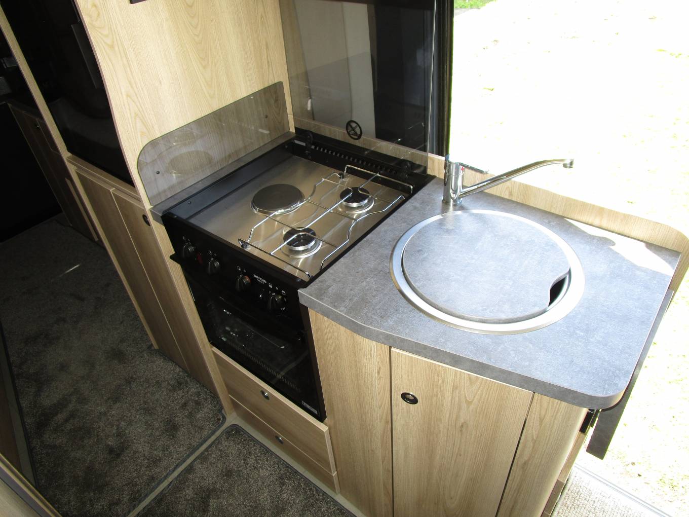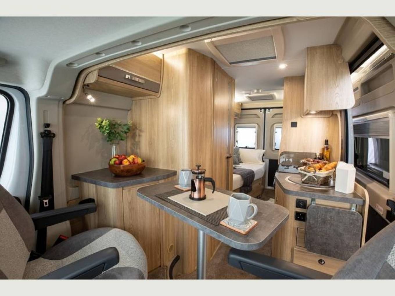 At the rear of the vehicle is a generous fixed bed that partially slides to the side to allow bikes etc to be loaded through the rear doors. Moving towards the front of the vehicle there is a generous washroom complete with Shower, Cassette toilet and hand wash basin. Opposite the washroom is a well equipped kitchen with Sink, 3 Burner hob, Combination oven and grill and Generous fridge with ice compartment. At the front of the vehicle both front cab seats swivel to create a dining area around a removable table. This vehicle benefits from Solar Panel, 19 inch TV, Wind out awning, Bike rack and paint and upholstery protection.
