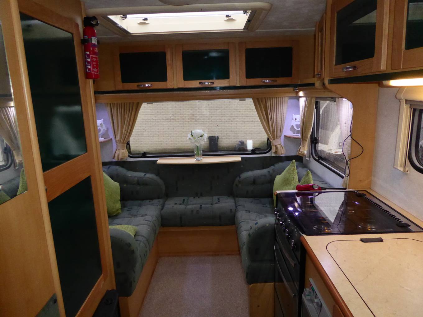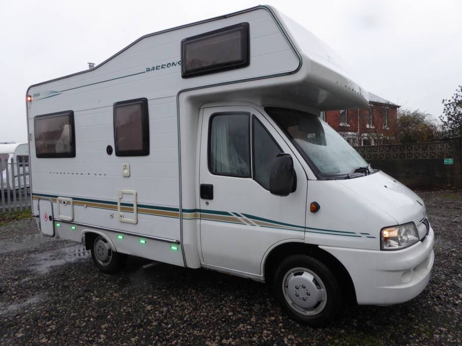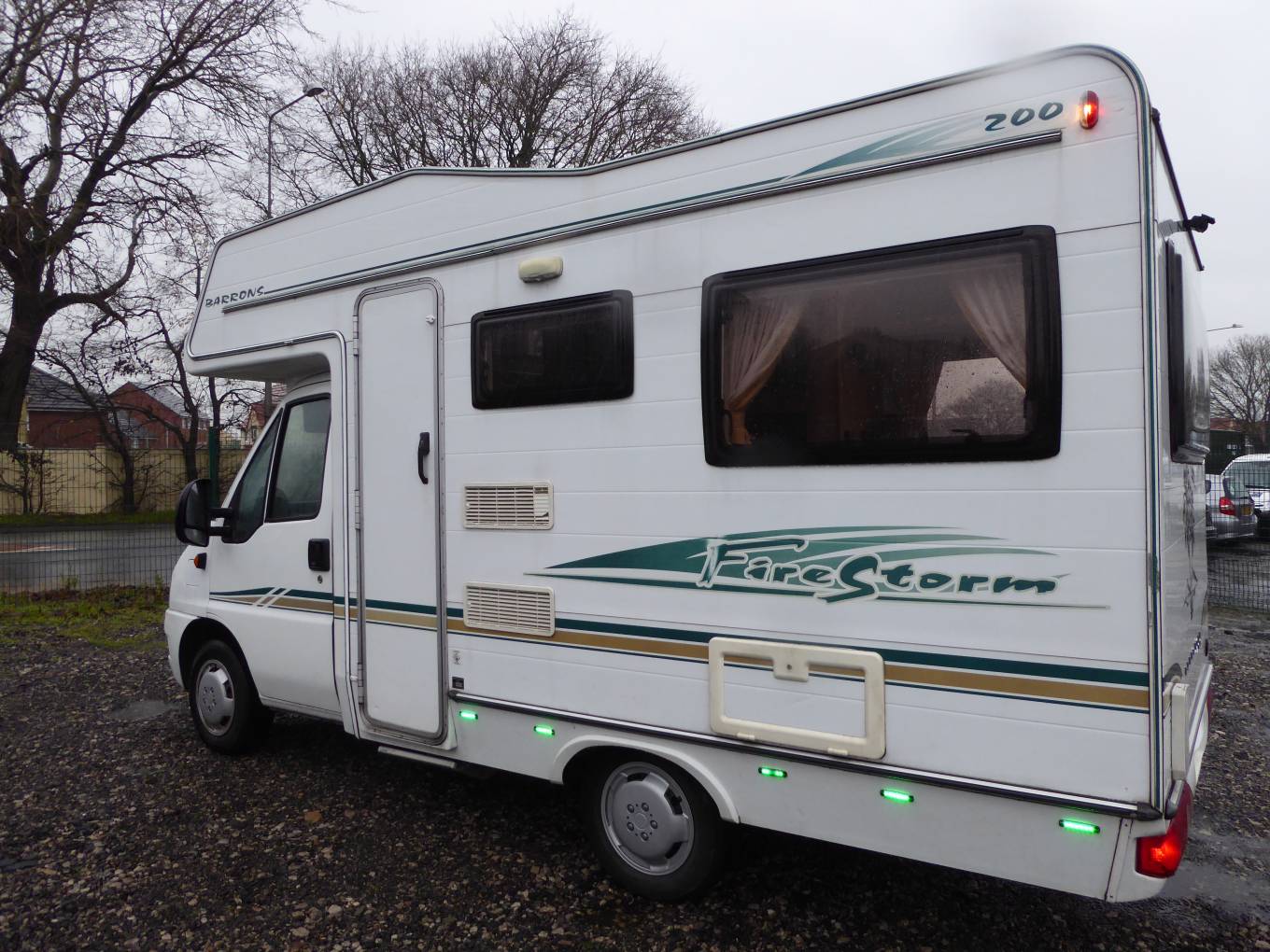 Call with any questions on 01423 609985. This is a special edition Elddis Firestorm 200 made under the Barrons trademark, first registered in March 2005. It has 3 former owners, travelled 56024 miles, is based on a Peugeot Boxer chassis and comes with an MOT until June 2019. The benefits of this motorhome are; the relatively short length measuring 5.38m long, so it fits into car parks easily; the much sort after U-shaped rear lounge and it weighs 2900kg so anyone is able to drive this vehicle. Internally at the rear you will find the U-shaped lounge which is in a nice green colour and is in great condition which forms a double bed when both sofas are pulled together measuring approximately 6ft 11inches x 4ft. Moving forward there is the kitchen which includes oven, grill, 4 gas burners, fridge freezer and sink. The washroom has a toilet, sink and shower attachment. Upfront the cab includes a radio/CD player, 5-speed manual gearbox, 2 seatbelts, reversing camera and above an over cab bed which can sleep 2 people. A nice little feature is the extra worktop space that can be created in the kitchen area and it also has an electric step for ease of access. The heating is provided by a gas fire and it comes with a solar panel. This is a great starter motorhome or something to downsize into. This can be viewed near Preston in Lancashire. Part Exchanges welcomed on this vehicle, for further information and photos please call us on 01423 609985 quoting reference 86520