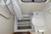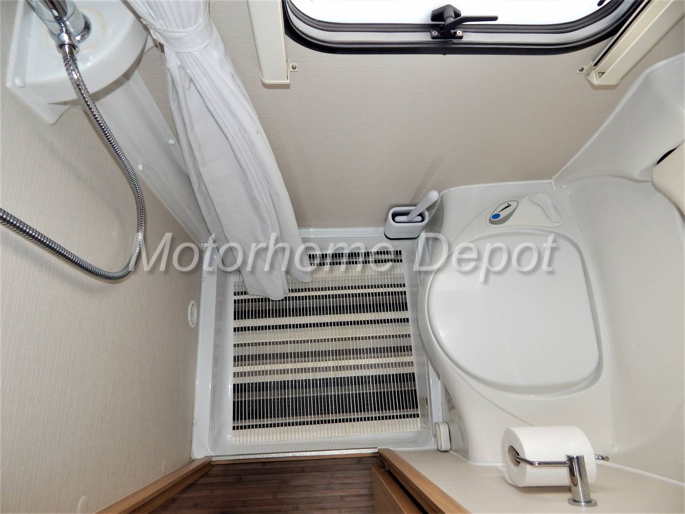 The bathroom also to the rear is a wet room style with a shower curtain and a Thetford fixed electric flush toilet. The sink folds away above the toilet to give more space and is white with a white mixer tap.