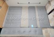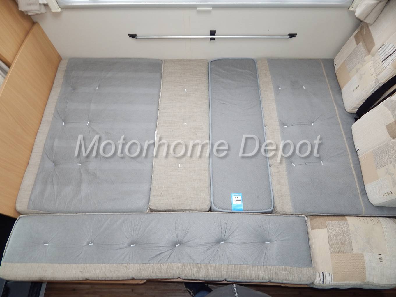 The dinette in the center of the vehicle consists of a forward facing sofa with 2 x 3 point lap & diagonal seat belts and rear facing sofa with no belts. The table fixes to the wall but can be stowed away while travelling & to the side is an additional sofa, you could easily seat 6 people if entertaining on site. This area drops down to make a large double bed with the use of a couple of infill cushions.