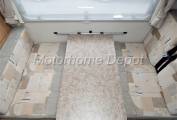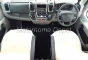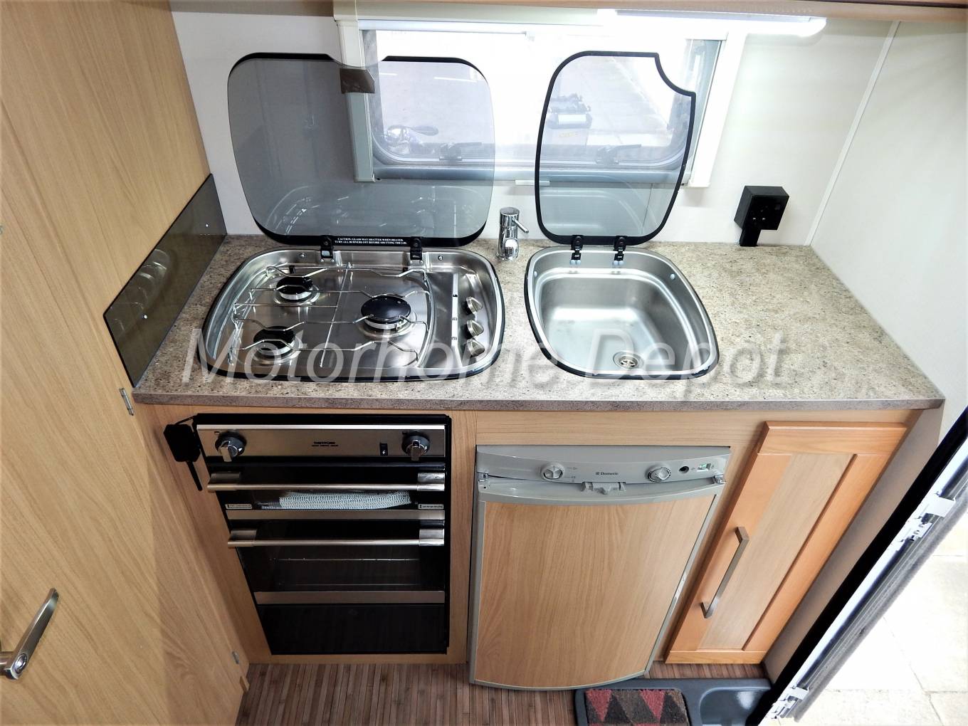 We enter the motorhome at the rear on the passengers side via an electric step, immediately to the right is the kitchen area with a full size Thetford Midi Prima 3 oven & grill with a 3 gas burner hob there plenty of cupboard & drawer space above and below for all your kitchen utensils. There is an oblong stainless sink with chrome mixer tap. Below the counter is a Dometic absorber fridge with freezer box, this can be powered by: 240v;12v or gas depending whether plugged in on site or wild camping.
