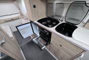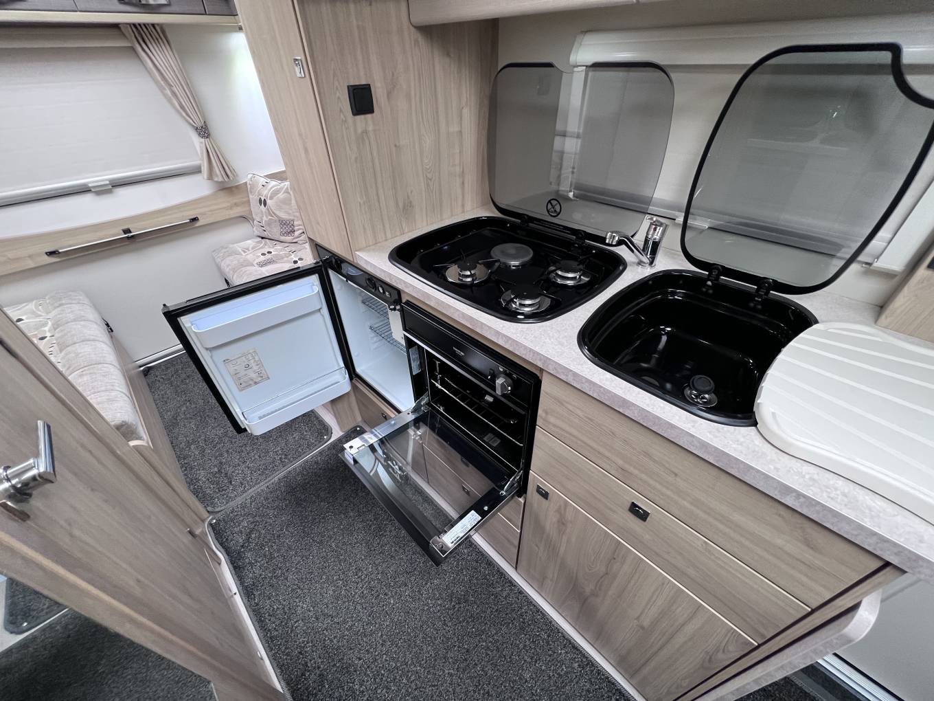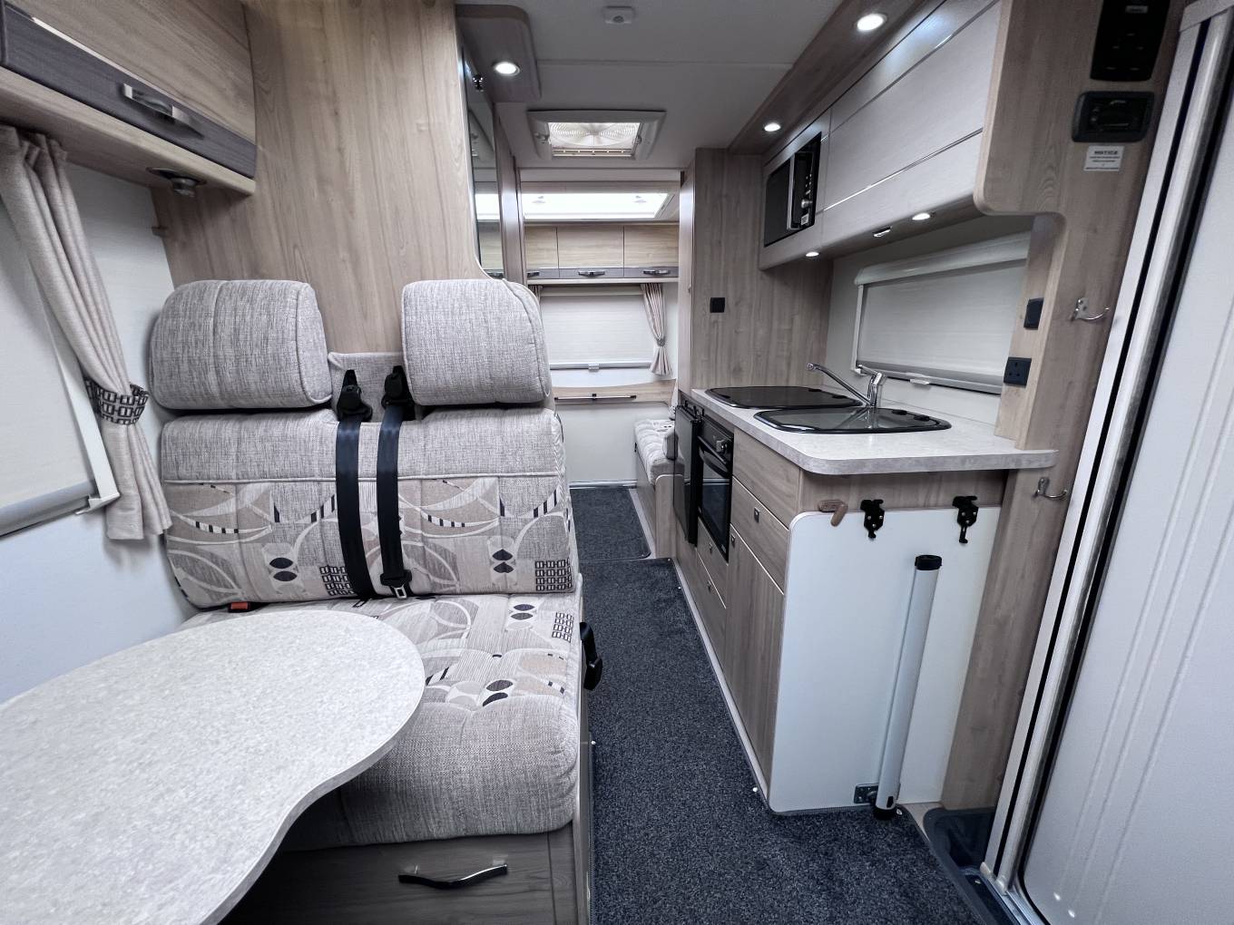 To your right, as you come in is the very well equipped kitchen consisting of a Three Gas Burner and One Electric Hotplate Hob, an Oven Grill combination, a Three Energy Source Dometic fridge, a Microwave Oven, a Sink with a removable drainer, plus plenty of cupboard space.