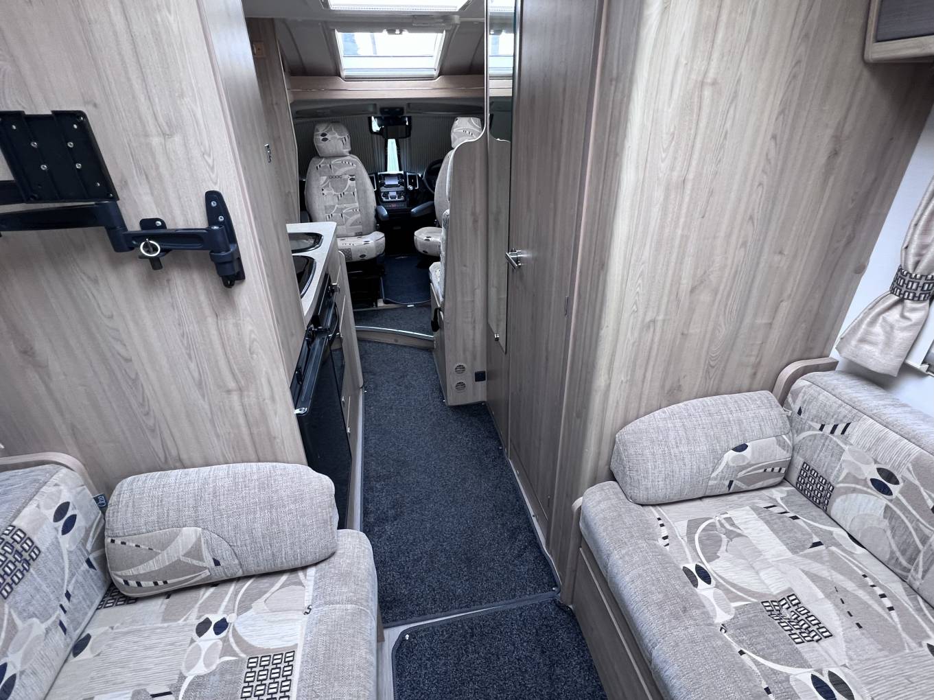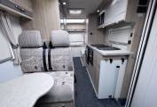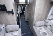 On entering via the flyscreen protected habitation door, in front of you are the forward facing belted passenger seats with a coffee table between them and the swivelling driver and passenger captains chairs.