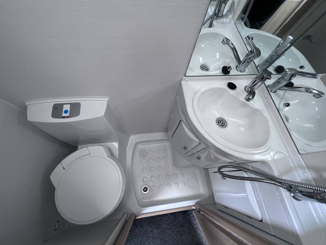 Opposite is the wetroom style bathroom where you will find a Thetford Cassette Toilet, a Wash Handbasin and a Shower.