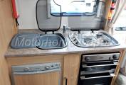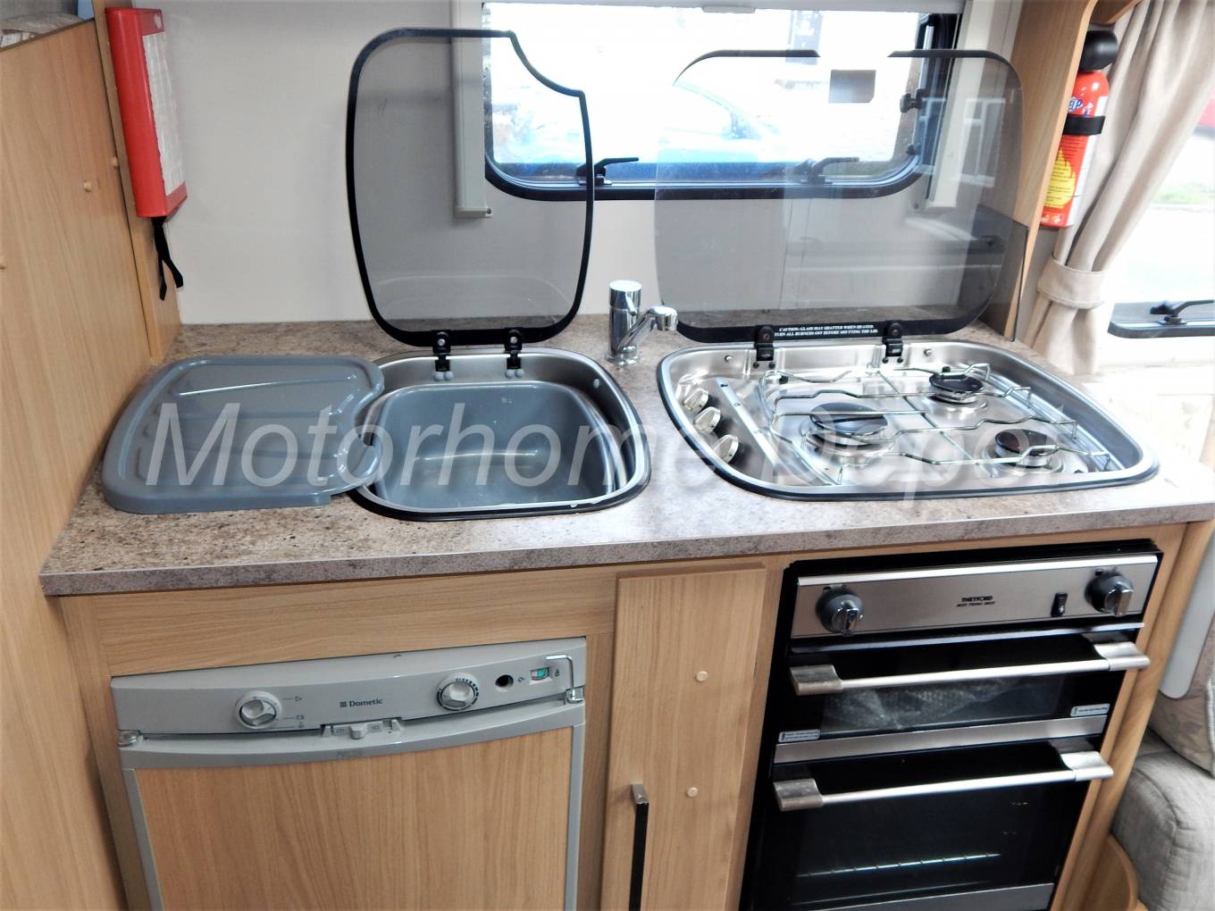 Moving rear the kitchen is immediately on your left , it consists of a three gas burner gas hob, an oval sink in a matt finish & has a chrome mixer tap, below a Thetford Midi Prima full gas oven and grill. There is ample drawer & cupboard space for all your kitchen utensils. Under the counter is a Dometic absorber fridge with freezer box that can be powered by 240v; 12v or gas depending on whether you are on site or wild camping.