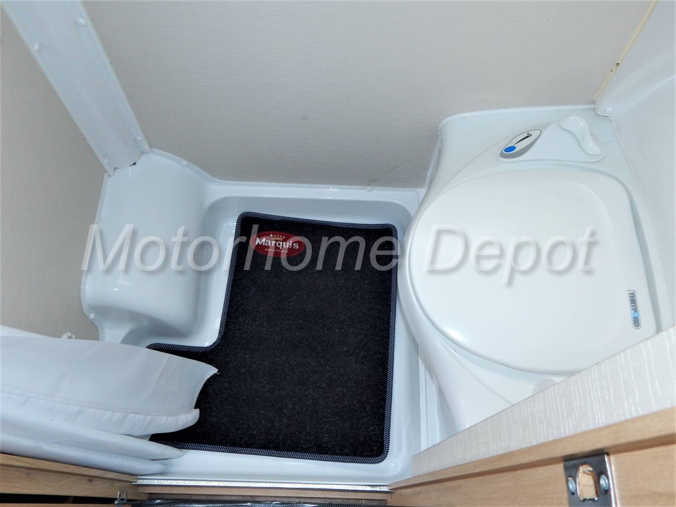 Opposite is the all in one bathroom which consists of a Thetford cassette swivelling toilet with fresh water flush, a good sized shower with curtain. The sink folds down from above the toilette and has a chrome mixer tap. Moving rear again is a large hanging wardrobe with the Truma heater below. Aslo Truma water heater & blown air for your camping comfort.