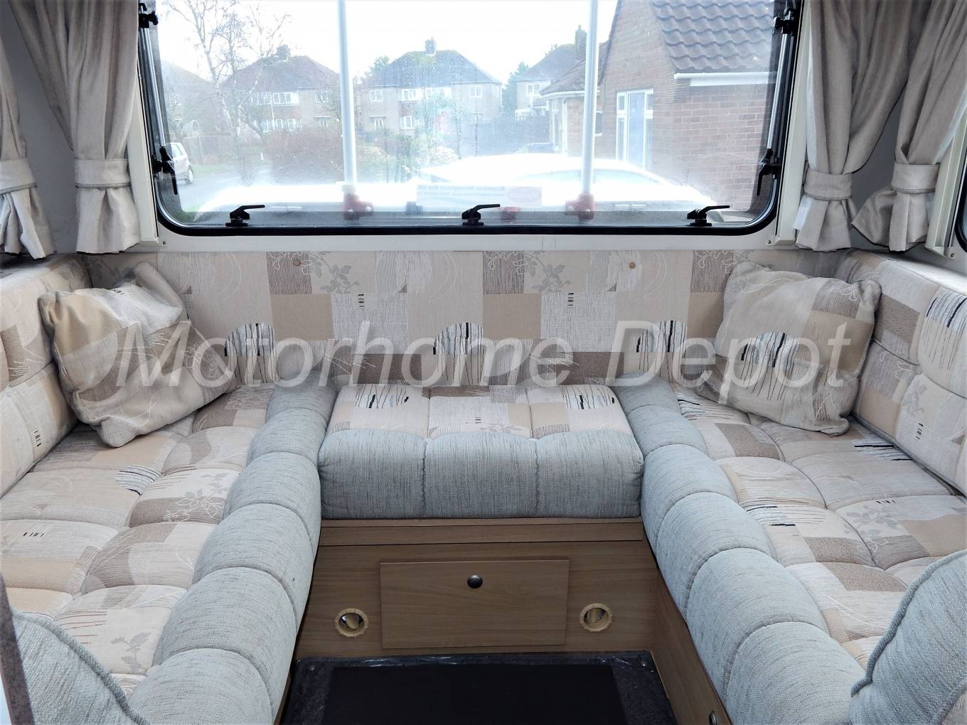 This ever popular Rear Lounge model of the Elddis Majestic 145 built on the Peugeot Boxer chassis it comes in a 2.2 Turbo Diesel engine & a 5 speed manual gear box. With only had 3 owners from new & ONLY 24207 miles, it has a comprehensive service history comprising of 6 stamps in the book the last carried out 01/2018. Previous Habitation services recorded with the last one being 02/18 at Marquis. The Cab benefits from: Air Conditioning; Cruise Control; Electric Windows Front; Electric Mirrors; CD player; Park sensors rear. The front seats both have arm rests and can rotate to face the rear while relaxing.