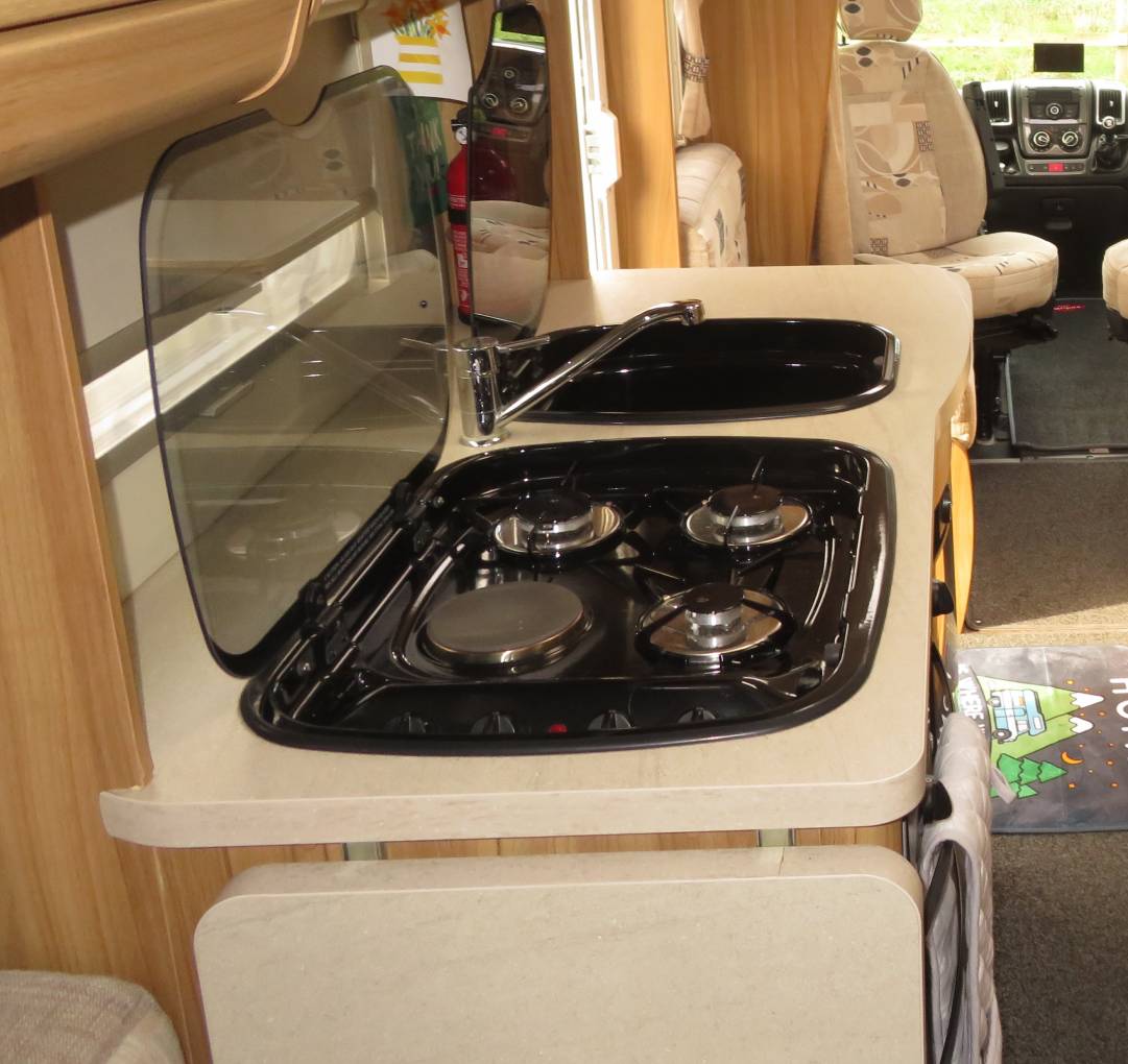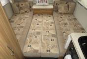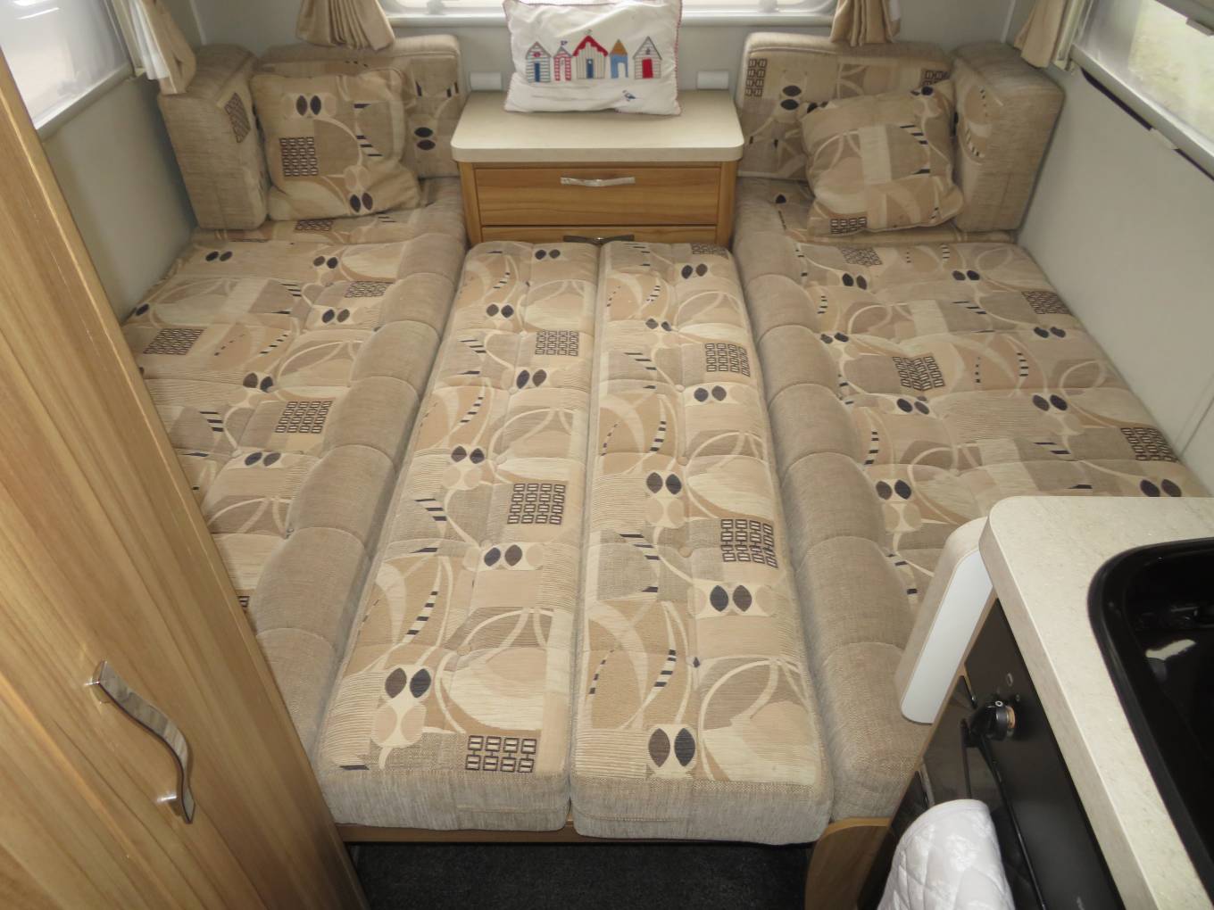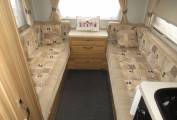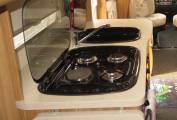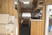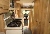 As you step into the habitation area you have a great front lounge area comprising of one side facing and one front facing double seat and two front seats that swivel round. There is a removable dinette table which is the ideal place to enjoy a meal or snack. As you move back there is an extremely well equipped kitchen area which includes oven, grill, microwave oven, hob with 3 gas burners and electric hotplate, sink with mixer tap and 3-way fridge with freezer compartment. There is also plenty of cupboard and storage space for all your ingredients and cooking utensils.