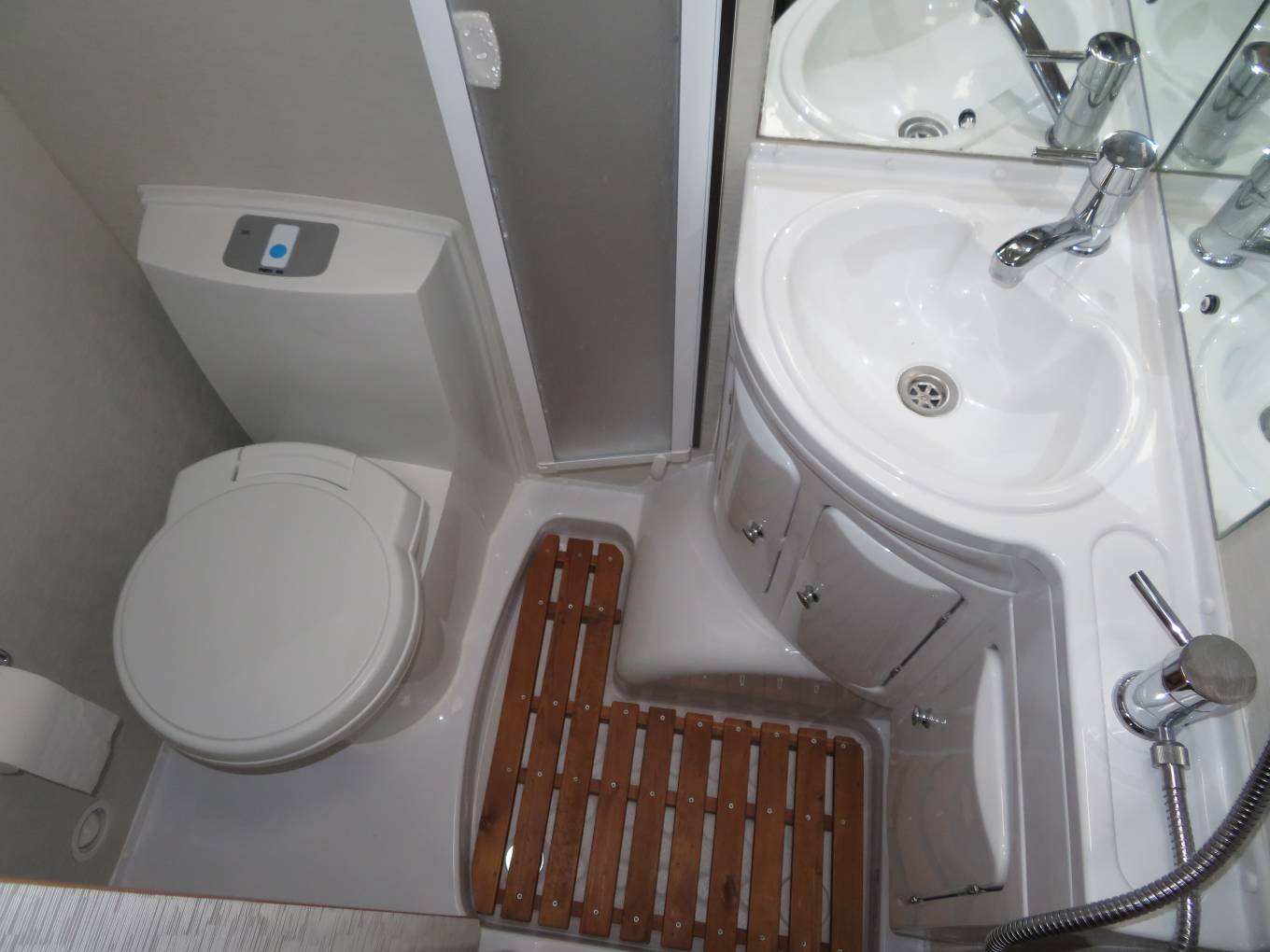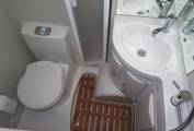 The Elddis Majestic 195 is a very comfortable motorhome to sleep in with one large double bed made out of the rear lounge sofas and another from the central dinette. There is also a decent sized washroom featuring a Thetford Flush cassette toilet, vanity sink with cabinet underneath and shower with screen.