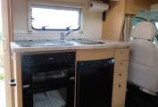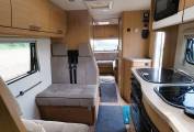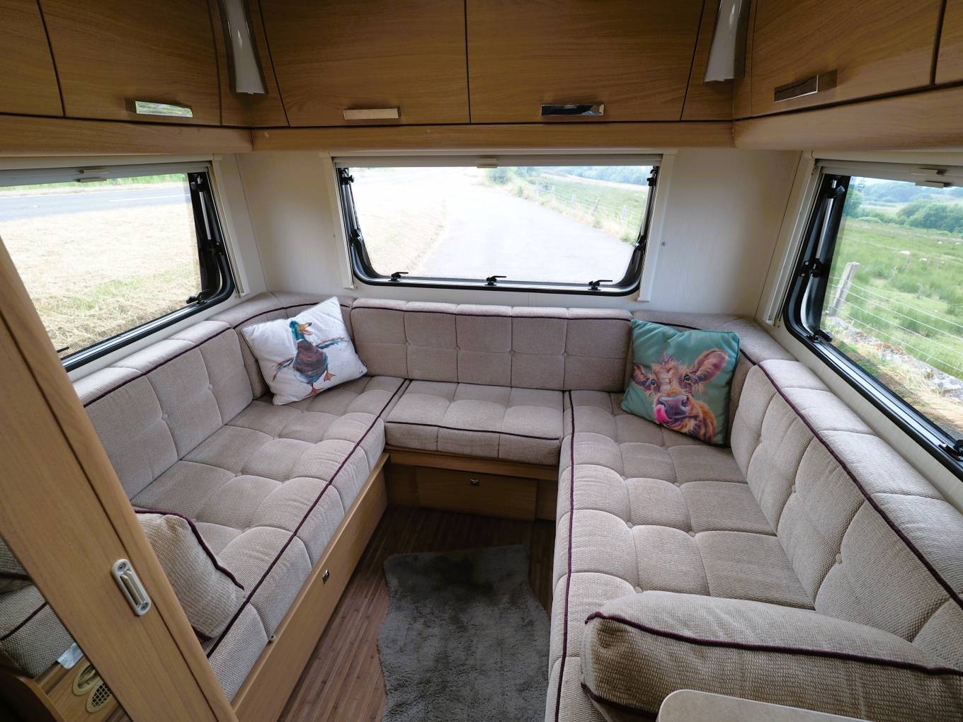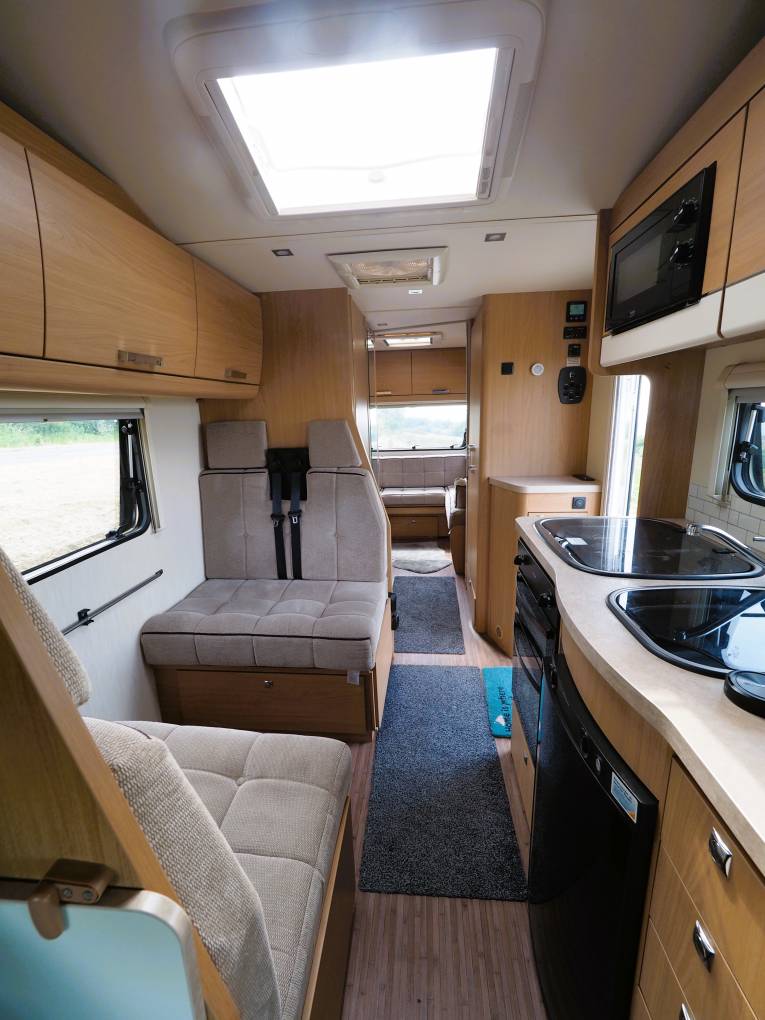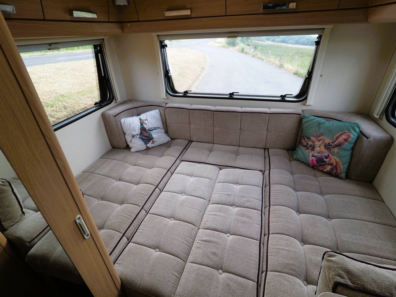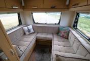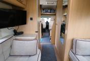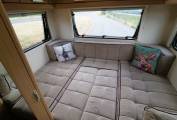 Accomodation is spacious with a large rear U-shaped lounge that converts to a massive double bed. Plenty of space for the family to sit round and relax, playing games, watching TV or dining with the retractable table that stores conveniently in its dedicated storage cupboard. Overhead storage lockers to the three sides with space under the sofas providing lots of space for all your personal bits and pieces. Natural lighting floods in from the large windows and overhead skylight.