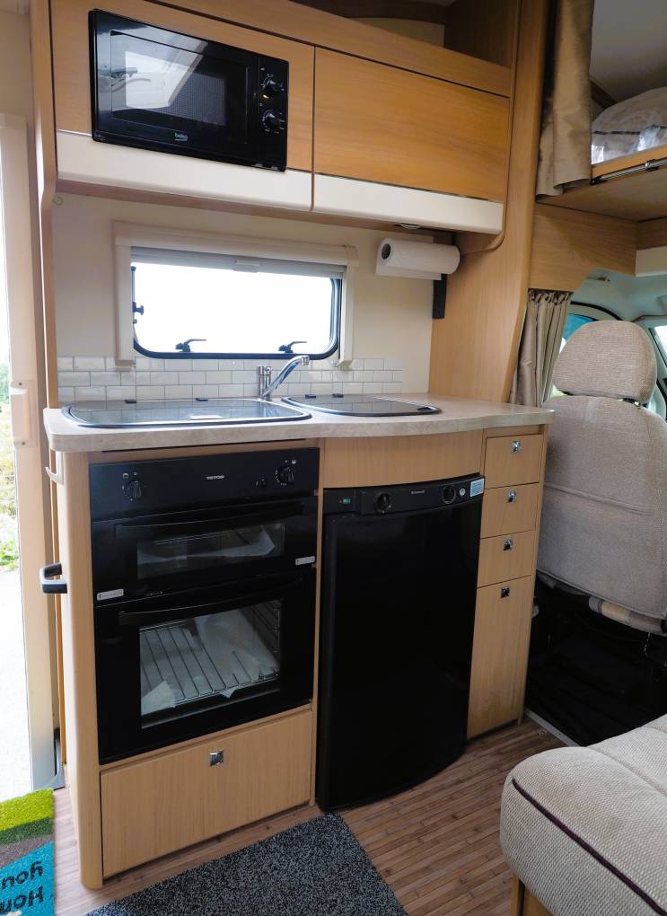 A fully featured kitchen to satisfy the most keen of cooks and everything you need to whip up anything from simple snacks to a full blown Sunday Roast. A duel-fuel hob with three gas burners and an electric hot plate sits atop the separate full oven and grill with a microwave oven set above the hob. A sink with hot and cold running water and a 3 way fridge freezer complete the kitchen equipment. Storage for food, plates and cups and cooking utensils in the overhead and under counter cupboards and drawers keeps everything to hand.