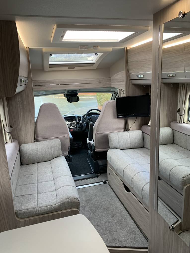 For the layout we start at the Rear with the spacious Bedroom area were you then have the rare 2 SINGLE BEDS that measure approximately 6 feet. This area can also be used as a large double across the motorhome and comes with the luxury HYPNOS MATTRESS and you have large surrounding storage underneath the beds, as well as a large wardrobe space. The interior is in excellent condition and you get a luxury feel in this motorhome and this is a theme throughout the Prestige!