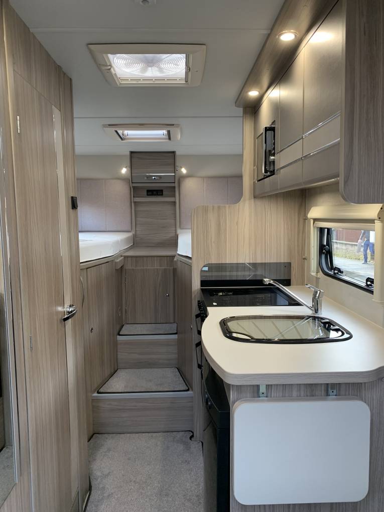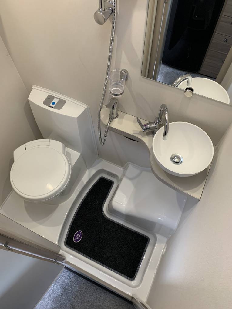 Mid habitation is one that offers plenty of natural light and here you have the kitchen area that is next to the habitation door which gives you extra ventilation when cooking up a hearty meal for any occasion. You have all the modern appliances you need to be self sufficient on your travels that include; modern fridge with freezer space, x3 gas hobs, 1 electric plate, microwave, separate oven and grill and again plenty of surrounding storage space. Across from the kitchen area you have the bathroom which again offers you everything you need to refresh after a day of adventure and again comes in next to new condition.