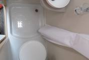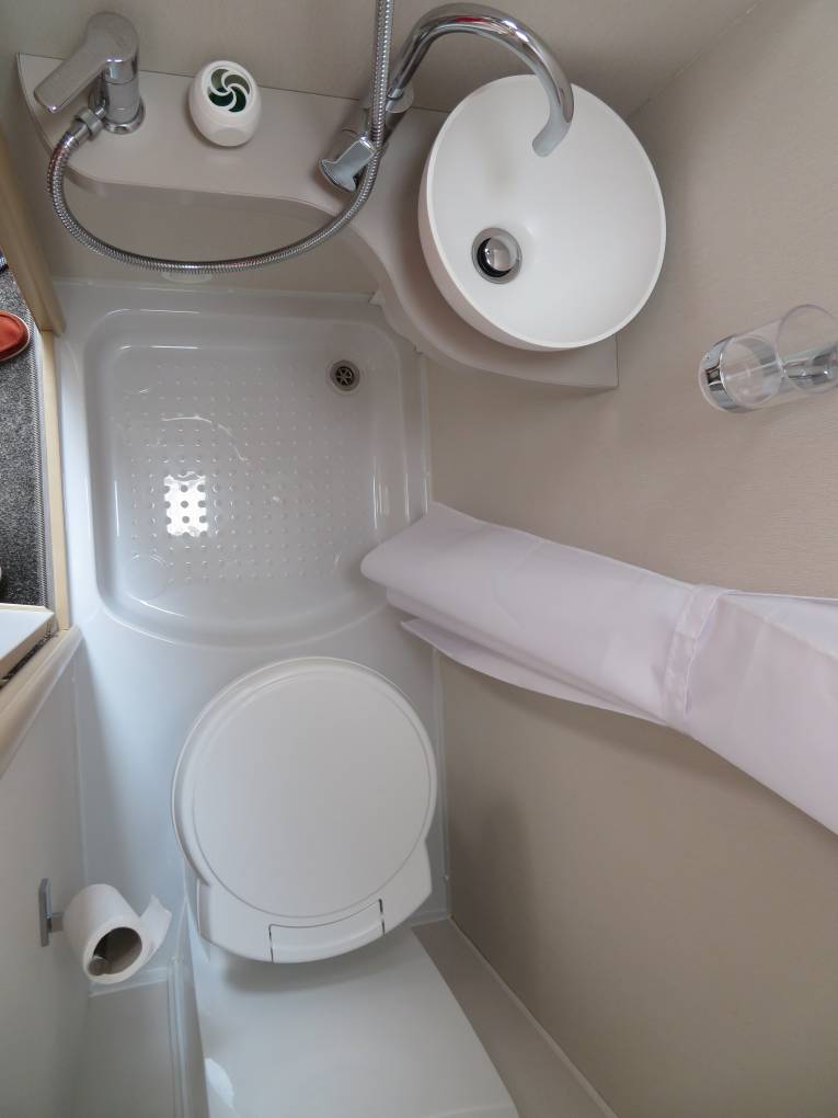 The 115 offers great sleeping options with the choice of either two single beds using the two captains swivel seats for your feet, or one extremely generous double at. The washroom is also well equipped with Thetford flush cassette toilet, sink and shower, there is a vanity mirror above the sink and a double cupboard above the toilet