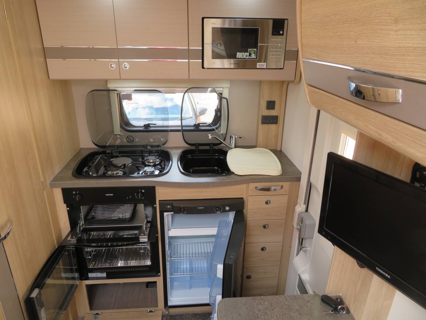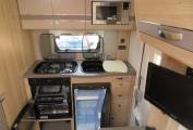 Starting the rear of the motorhome you have the extremely well equipped kitchen area with combination oven and grill, 3 burner black enamel hob, with one electric ring, microwave, black enamel sink with glass top for extra preparation area. Fridge with freezer and additional slide out work top area. The 115 also comes with plenty of cupboard and storage space for all your utensils and ingredients, everything you need to prepare a perfect meal.