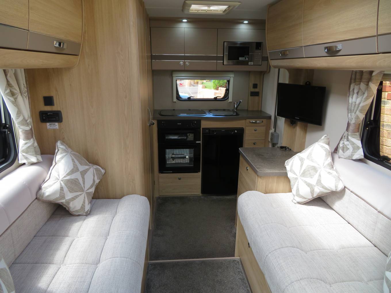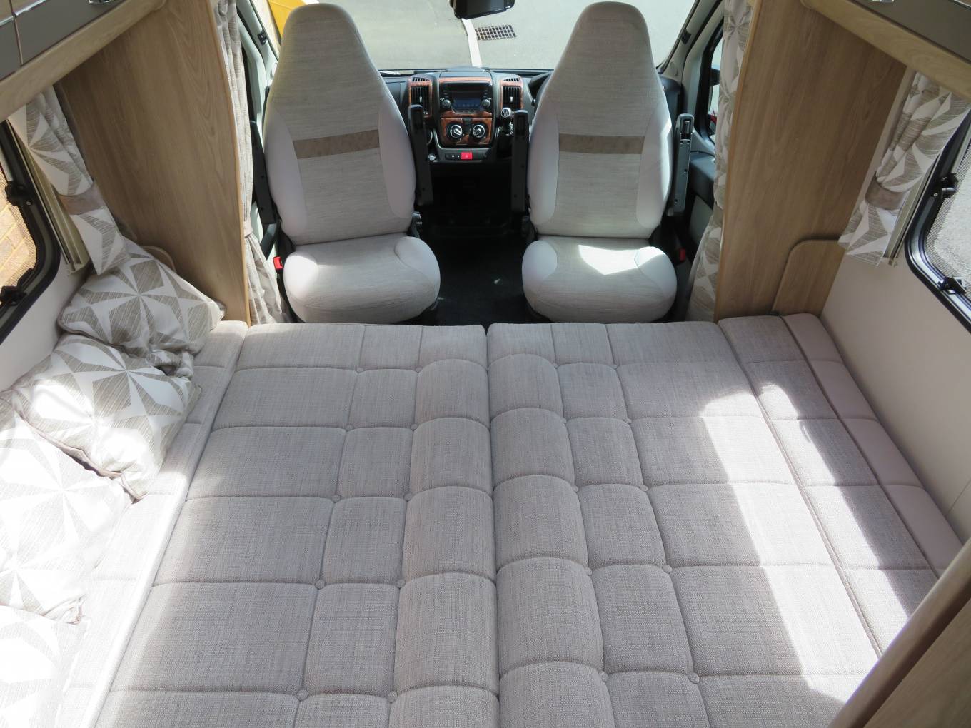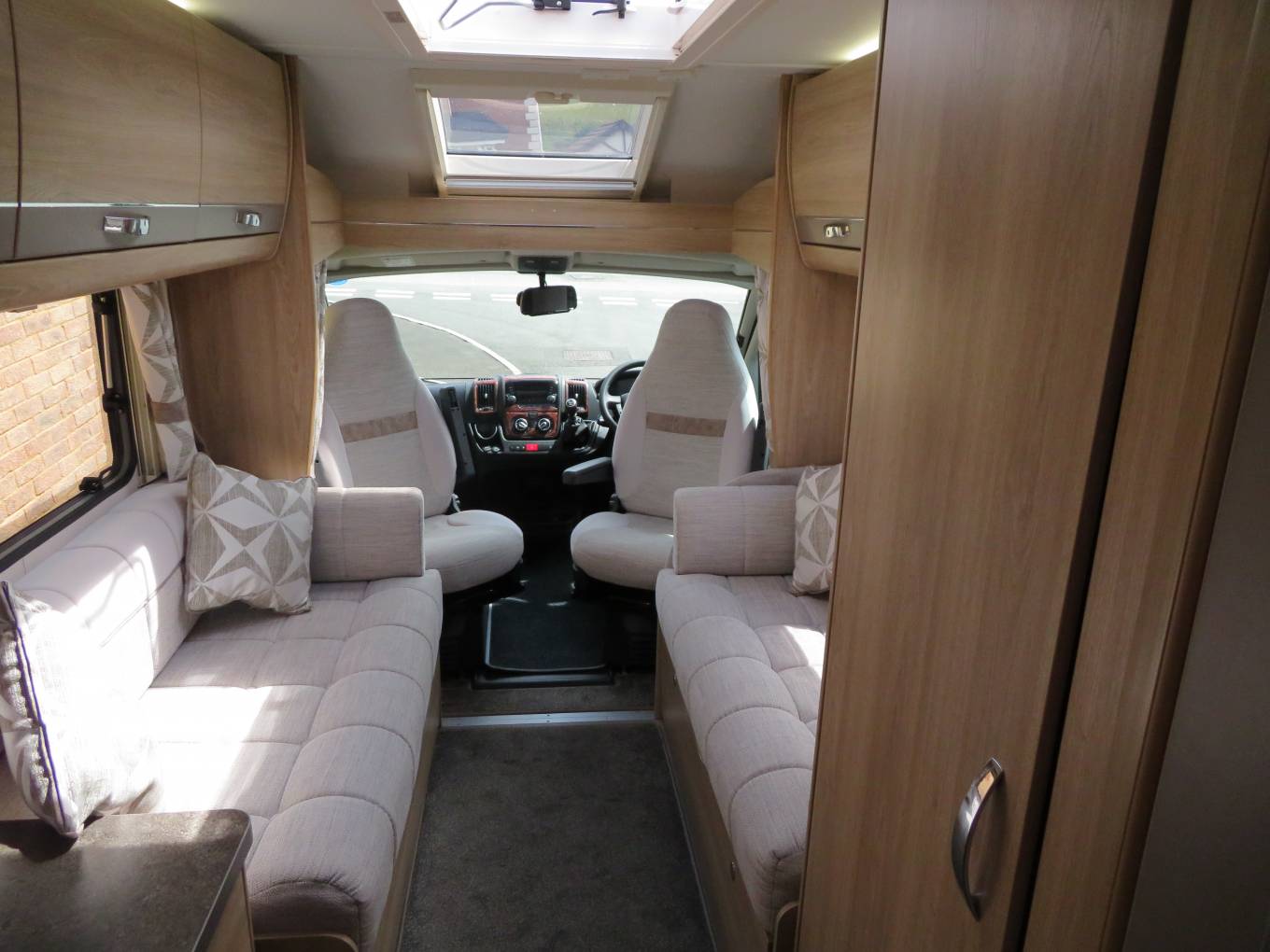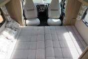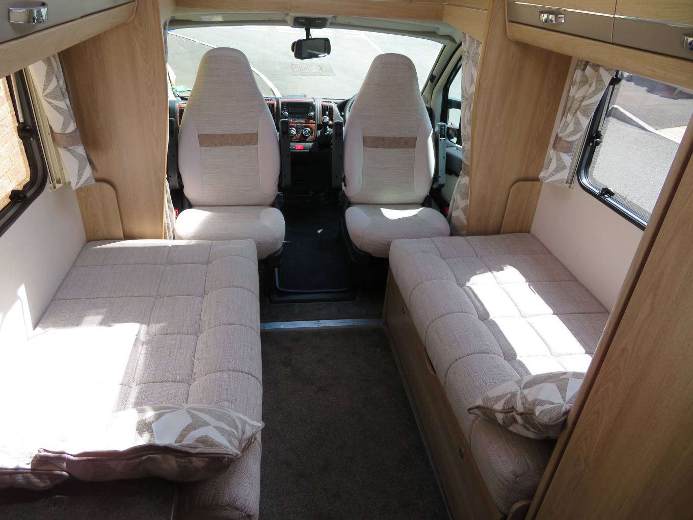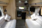 Moving forward you come to a wonderfully comfortable lounge area, providing the perfect place to put your feet up and relax. This area has large windows which allow the natural light to flood in. This motorhome also carries a folding table which can be placed to create the ideal dining area, comfortably seating 4 people.
