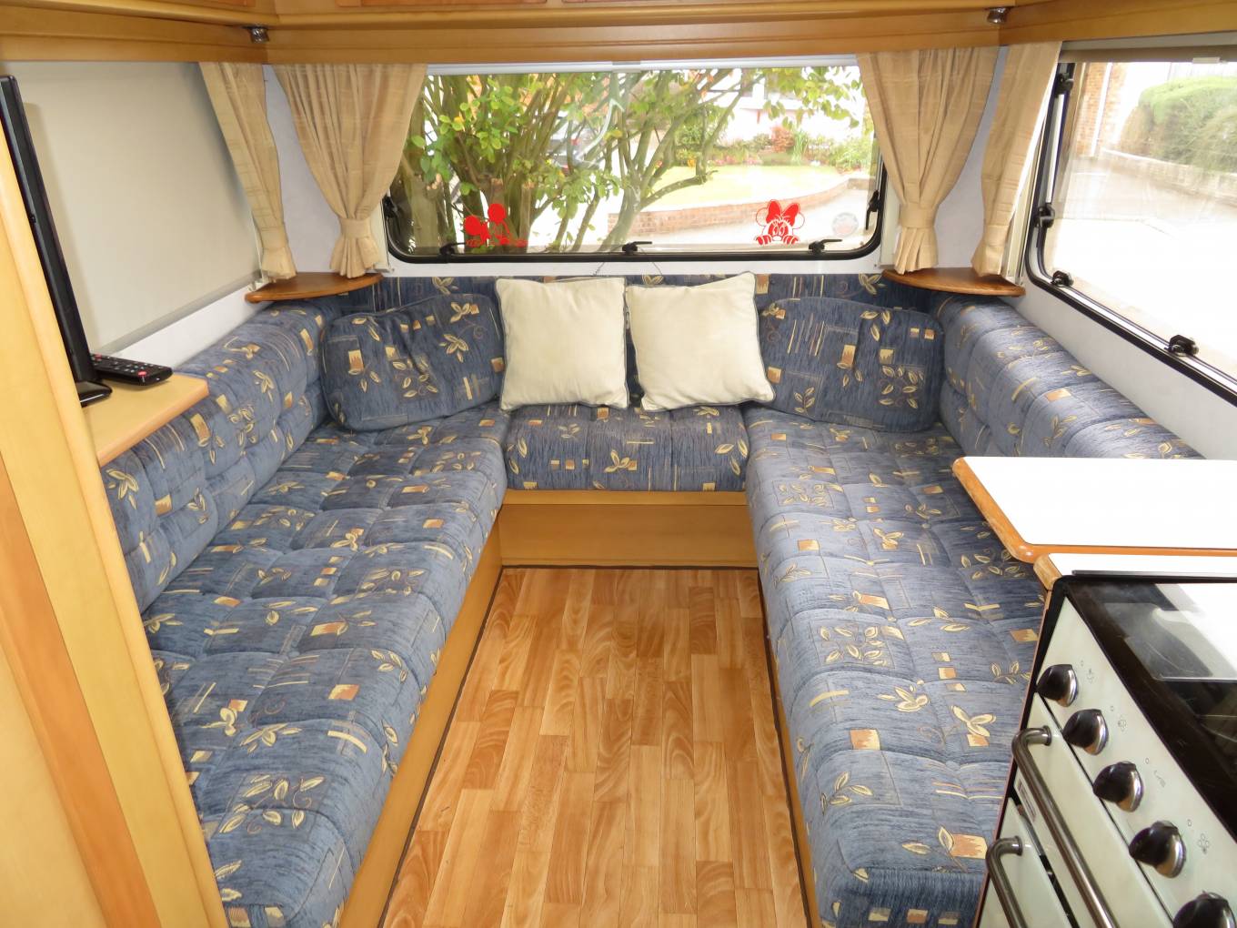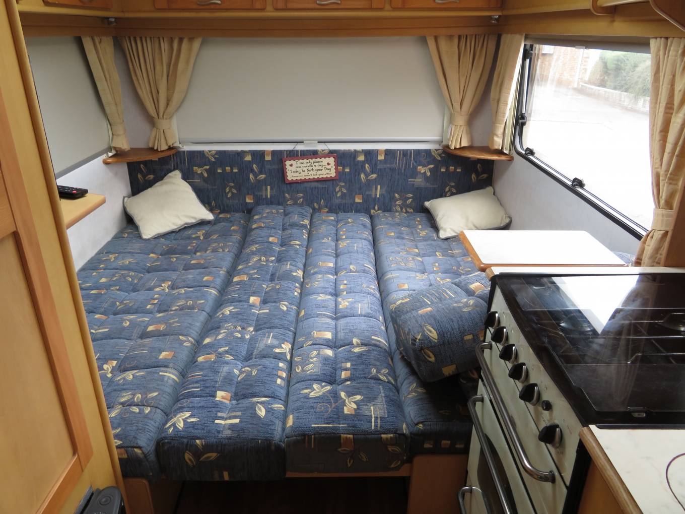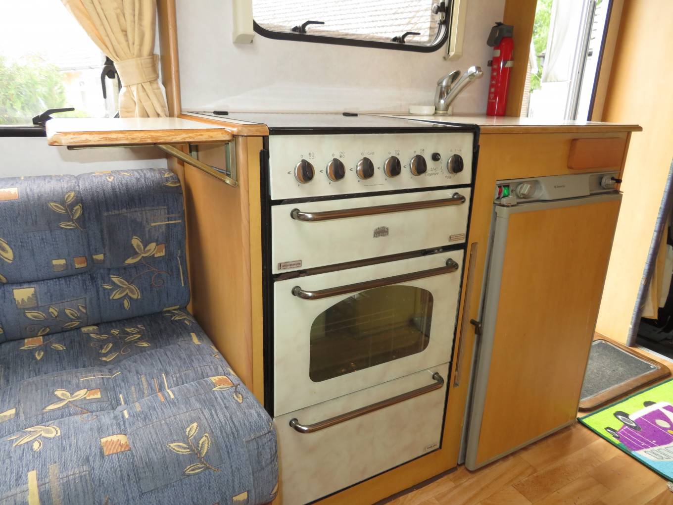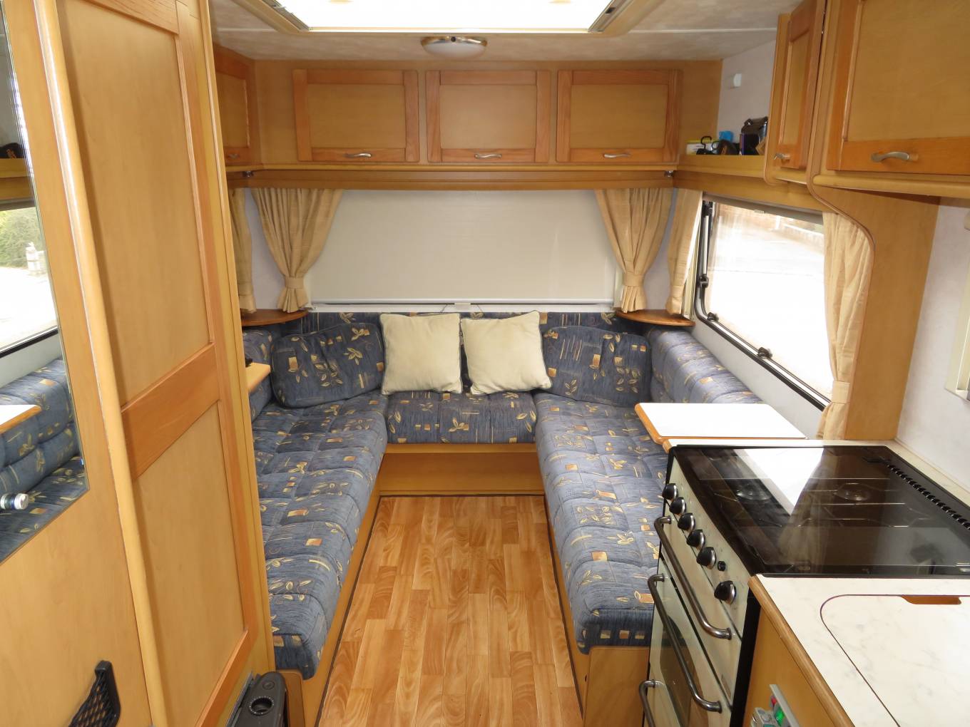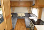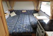 Moving forward the Elddis has a well equipped kitchen which includes an oven with grill, a gas hob with 4 gas burners, a sink with mixer tap and a 3-way fridge with freezer compartment.