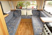 The main feature of the Elddis is the extremely comfortable U shaped lounge at the rear of the motorhome. With plenty of windows that let the natural light flood in this is a great place to put your feet up and relax with a good book or watch the TV that comes with this motorhome. There is a cleverly stored folding table that can be placed in the middle to create an ideal dining area that can comfortably sit 5 people.
