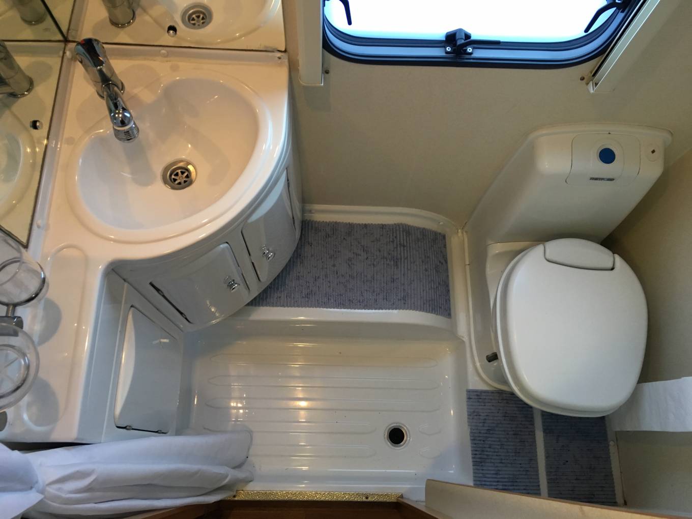 forwards to the washroom, which has a Thetford swivel cassette toilet,