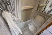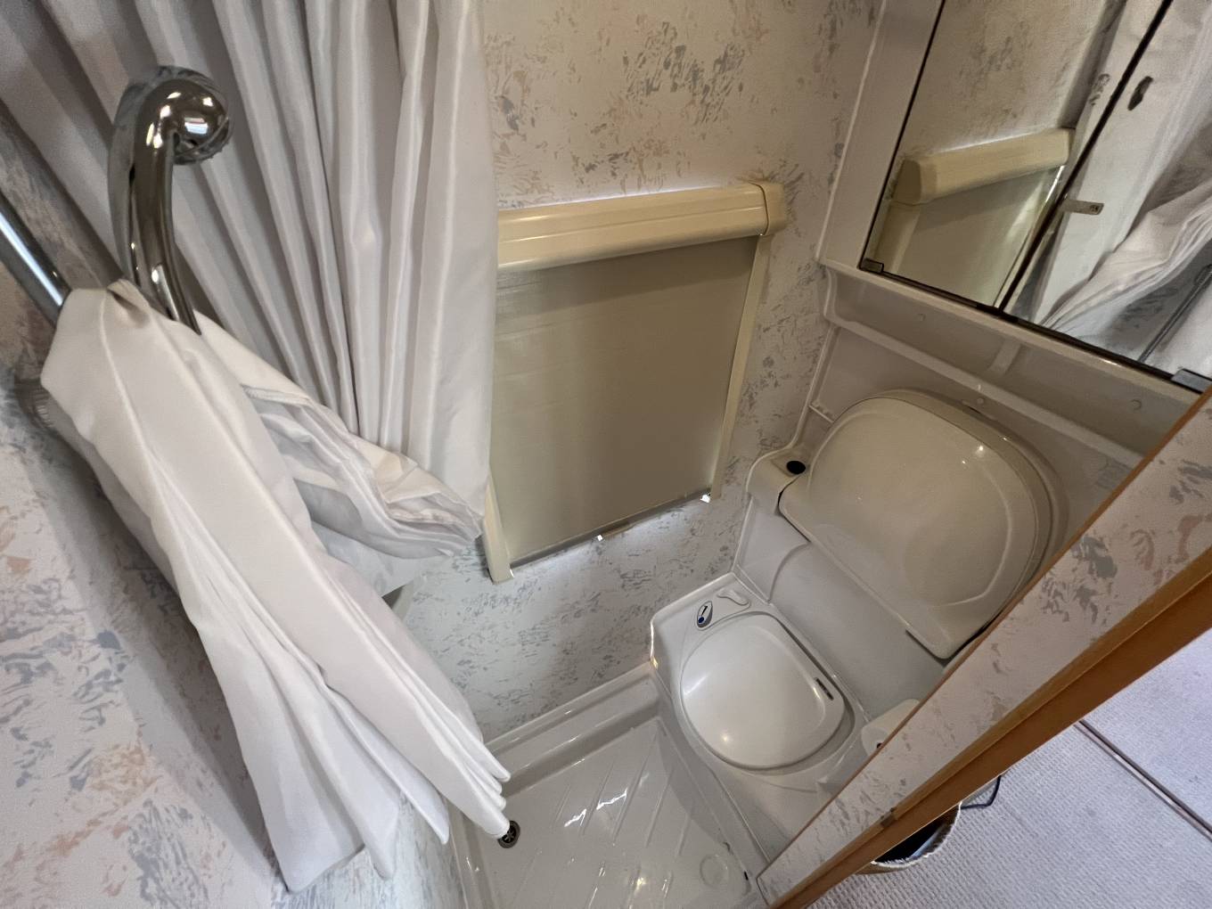 Behind the driver’s seat and opposite the entrance door is the compact bathroom consisting of a Thetford Cassette Toilet, a tip up large hand washbasin, a shower unit with curtain plus a mirrored cupboard.