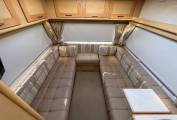 Across the rear of the motorhome is the huge U shaped lounge with included Avtex television and a removable dining table.