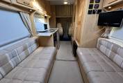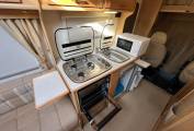 To the right as you enter the motorhome is the fully equipped kitchen where you will find a Three Burner Hob, a combined Oven and Grill, a three energy source Dometic refrigerator, a sink with hot and cold water supply, two worktop extensions and plenty of cupboard space. A stand alone Microwave Oven is also included.