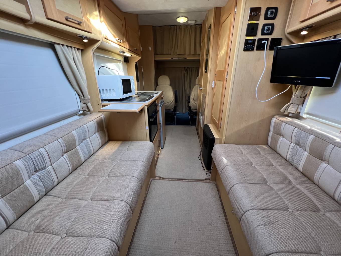On entering via the flyscreen protected habitation door, to your left is the driver’s cab with thick curtains for inside the windows as well as a set of outside Silver Screens for added insulation.