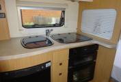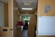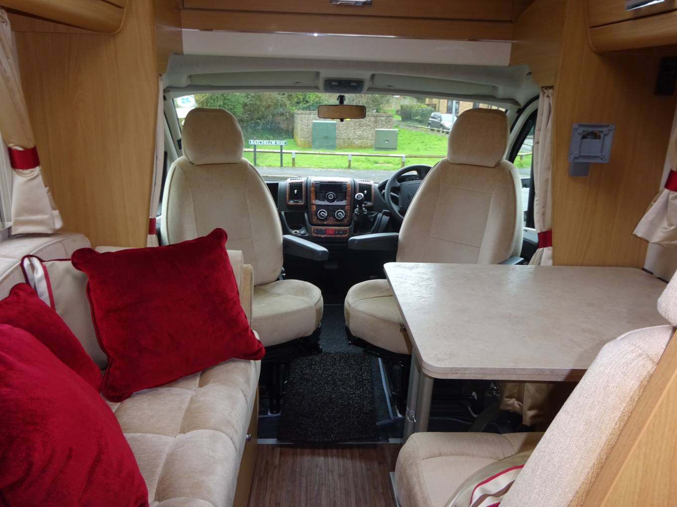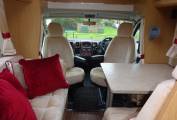 Moving forward again, there is two forward facing seats with belts in the dinette area and a side-facing sofa opposite. The drivers and passenger seats swivel round to accommodate four for dinner with ease. At night this area can be made into a double bed. Again there is ample storage and LED lighting to set the mood.