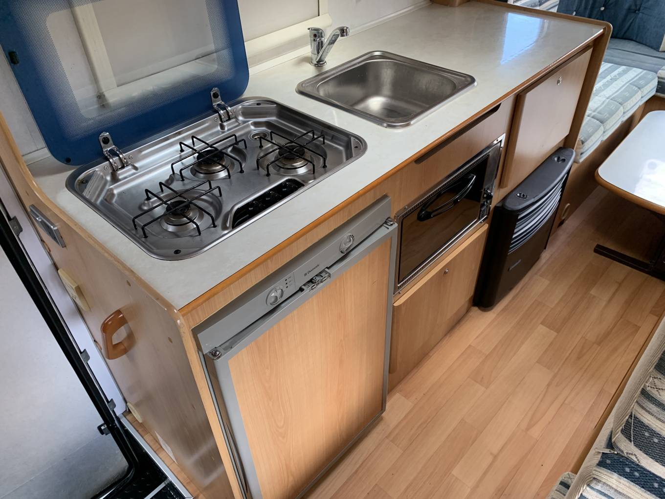 way fridge with freezer box, washbasin with mixer tap and also an oven and