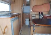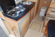 As you move forwards through the motorhome the kitchen is situated on your right and the dinette is on the left. The kitchen is equipped with a 2 gas burner hob, a 3 way fridge freezer, a sink and tap and a freestanding oven and grill. The dinette consists of forward facing and rear facing sofas and a dining table that can be taken down and folded away. The dinette also converts in to a double bed.