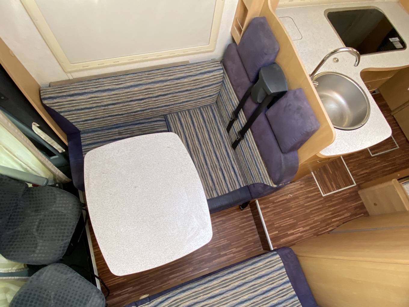 Down a step into the lounge area consisting of a settee on one with side forward facing belted seats and small settee on the other.