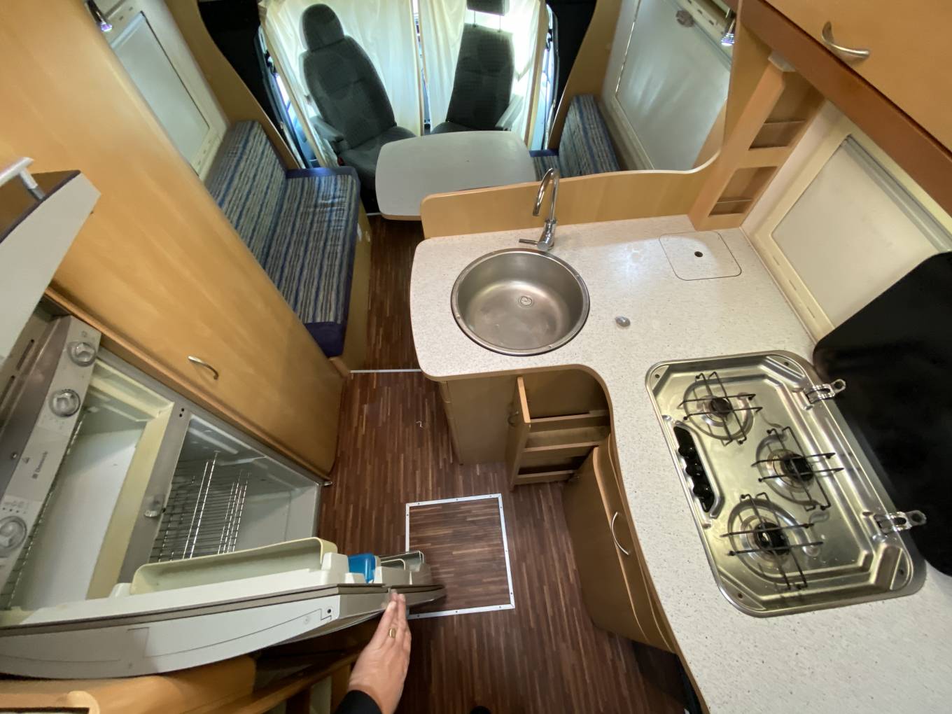To the right of the door is the kitchen consisting of a three burner hob with a microwave below and a Dometic three energy source Fridge Freezer with Oven Grill above on the opposite side of the motorhome.