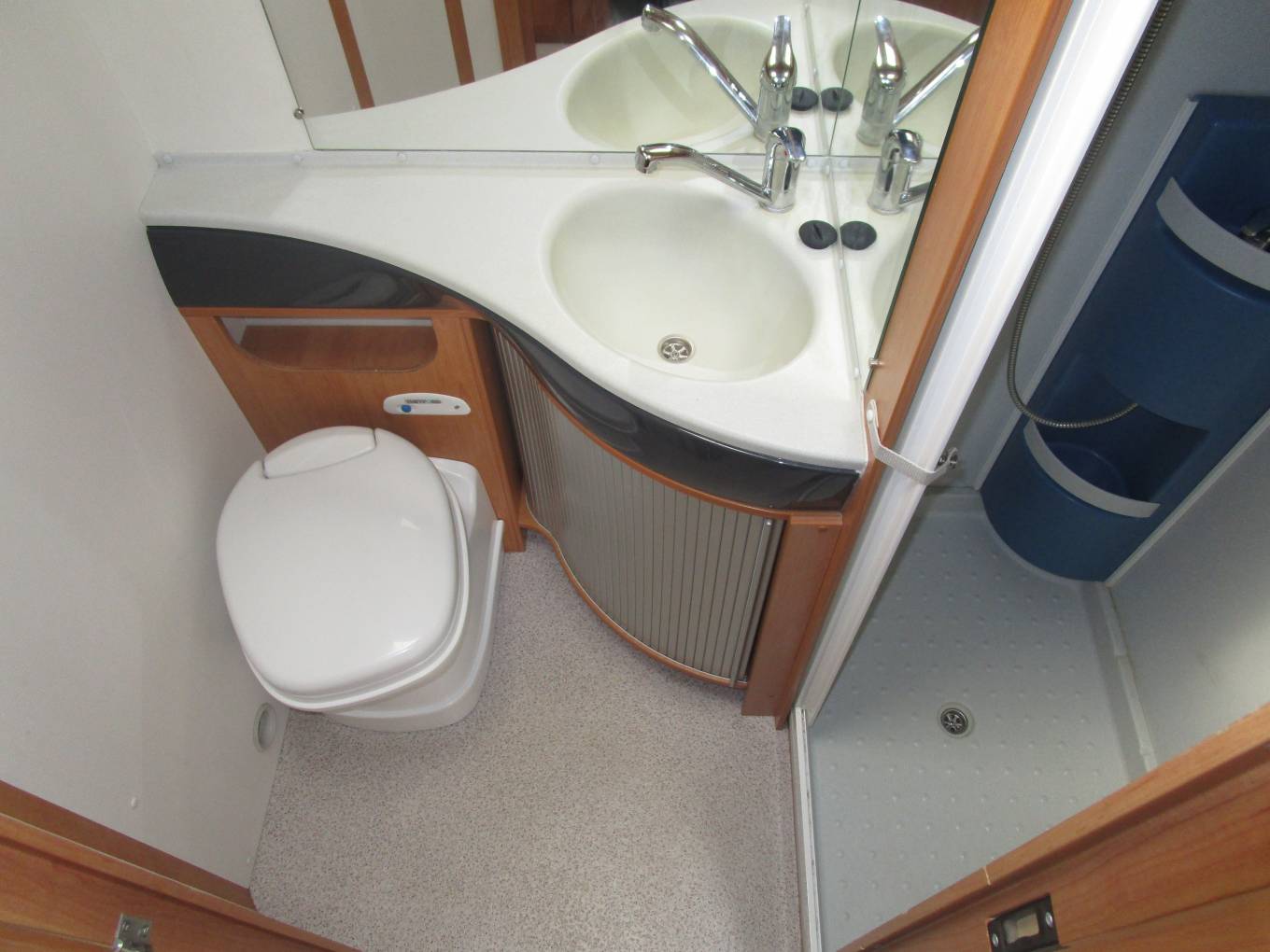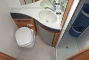 Opposite the kitchen you will find the washroom with separate shower cubicle, washbasin with vanity unit and Thetford cassette toilet. The spacious wardrobe is located next to the washroom and there is an abundance of storage throughout the vehicle at eye, floor and underfloor level.