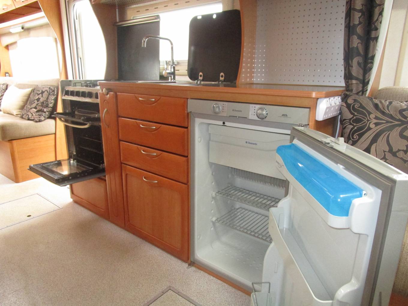 The kitchen is located to the centre of the vehicle and comprises of a 4 ring gas hob, separate grill and oven, sink with hot and cold water and fridge with small freezer compartment. There is also plenty of storage.