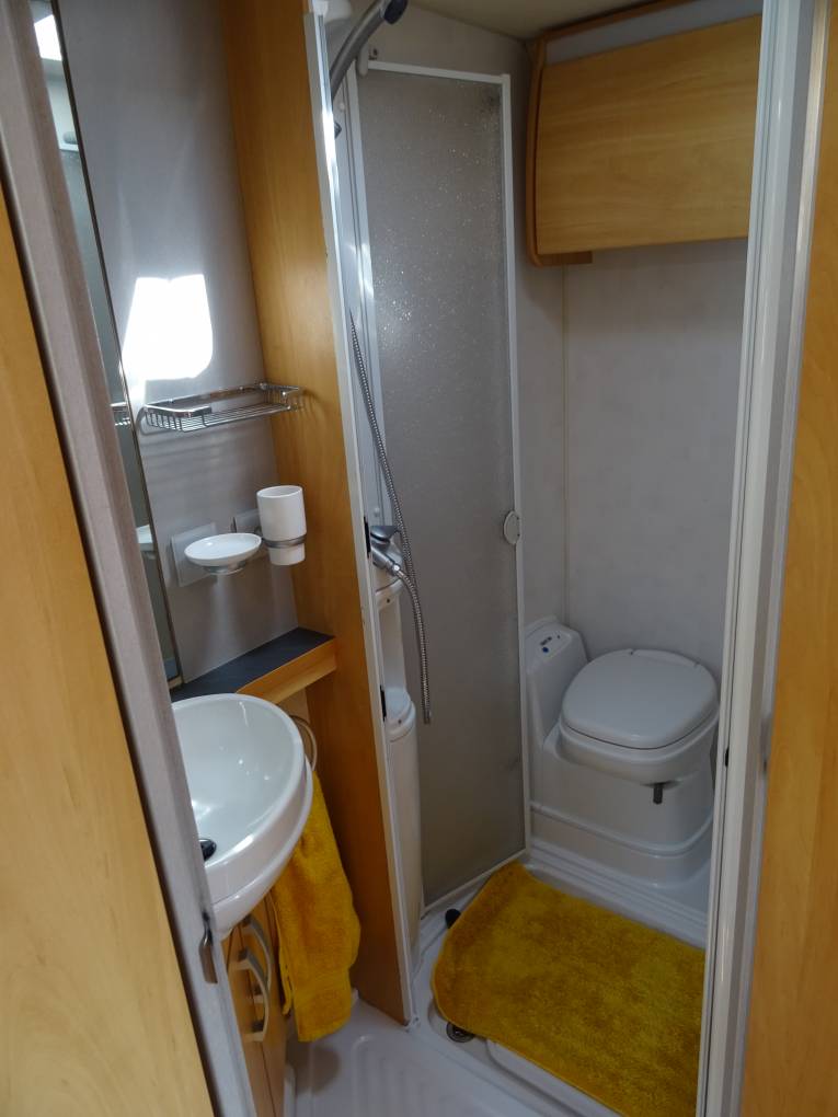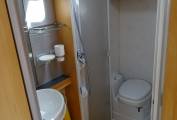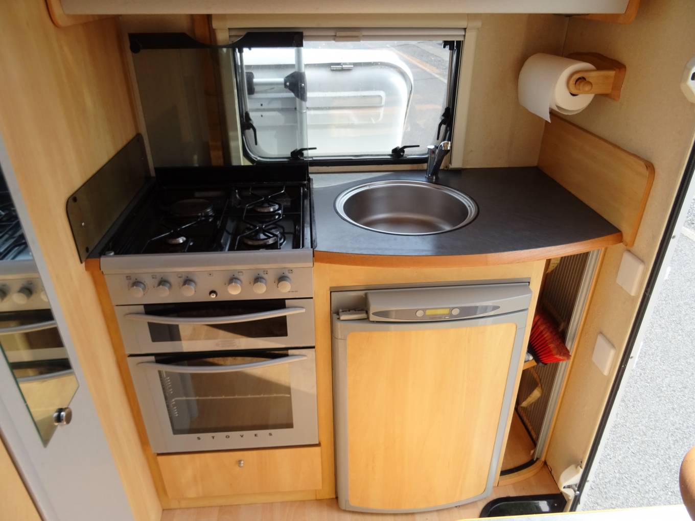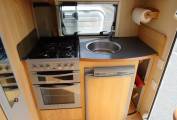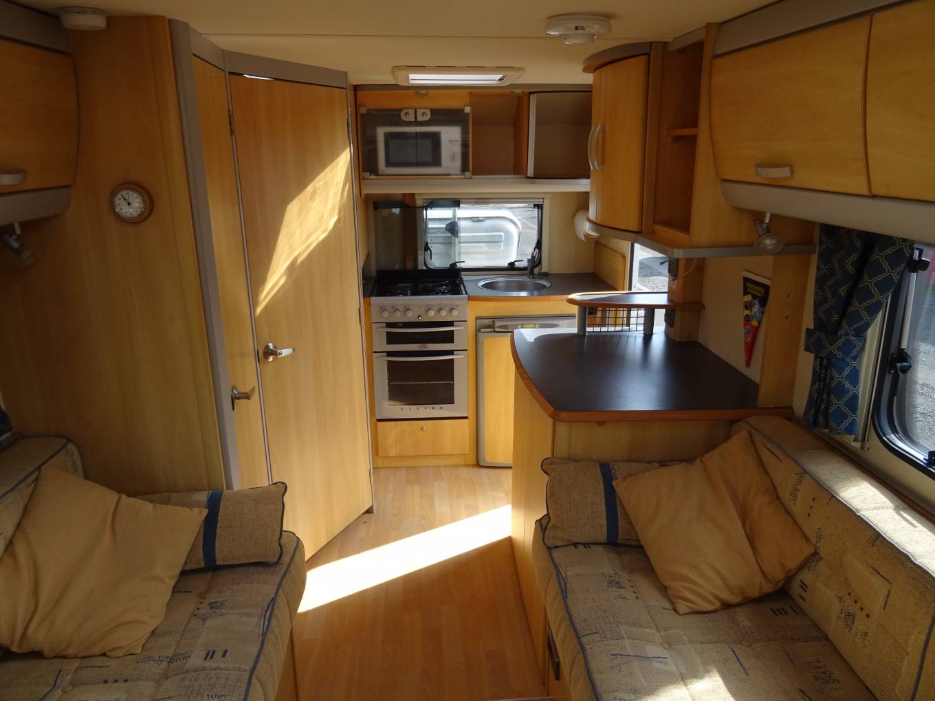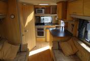Internally, there is an end kitchen with plenty of room to work in - equipment includes an oven, grill, 3 +1 hob and a microwave, with plenty of storage space for a long trip away. Next to the kitchen is a decent sized washroom, with a cassette toilet, shower basin and vanity unit.