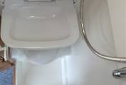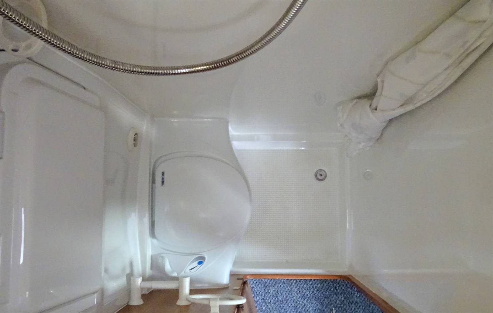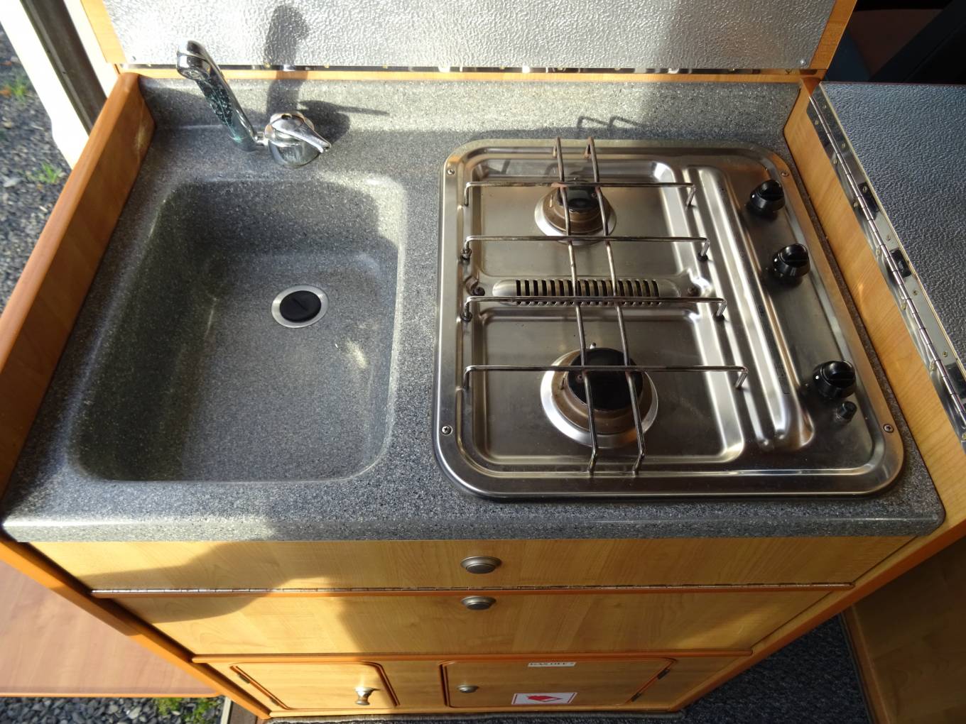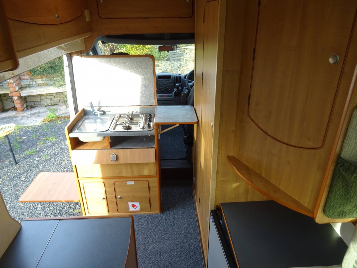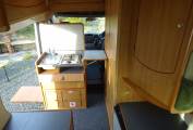As you enter the Camper Mid ship we have the kitchen area with a 2 ring gas hob, grill, sink with mixer tap and a fridge with separate freezer compartment. Also midship is the washroom with a toilet, drop down sink with mixer tap and shower.