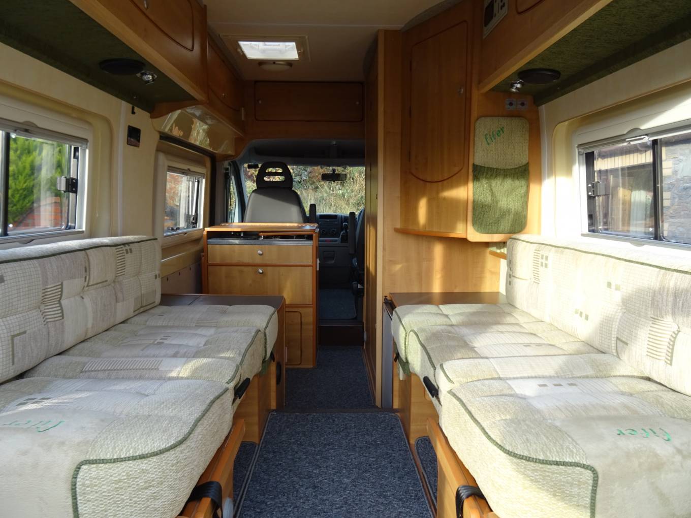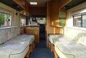 At the rear is the large lounge area with its twin side sofas, and with the stowaway table its a great area to dine or relax in. To sleep it can be used as 2 singles or can be converted into a large double bed.