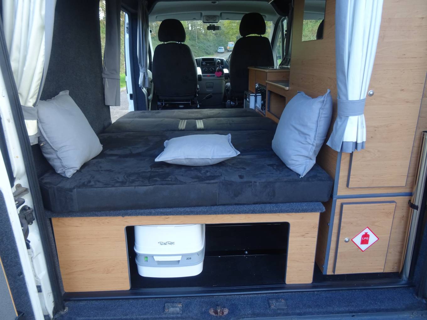 The kitchen is well equiped with and an unused stainless steel grill, intergrated stainless steel single bowl sink and 2-ring gas hob with a compressor fridge and a freezer box. A pillar mounted table, which can be found stored in the rear door, can be deployed for meal times and entertaining, with two Captain seats allowing four people to seat comfortably. Storage is plentiful in this thoughtfully designed conversion with overhead lockers, cabinet and under seating storage available for all your essentials when travelling. A Porta Potti is provided with the Fiat Ducato Campervan, along with a hook-up lead, and silver screens for the front wind screen and side windows.