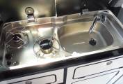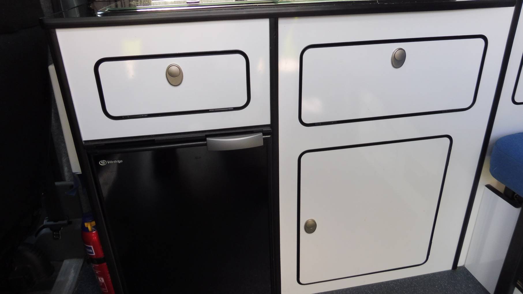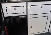The interior has gloss white cabinetry with black detailing giving a bright and clean feel to the living area. The kitchen is fitted with twin burners, sink and Vitifrigo fridge. The pop-top has zip-out windows which further enhances the airiness of the camper.