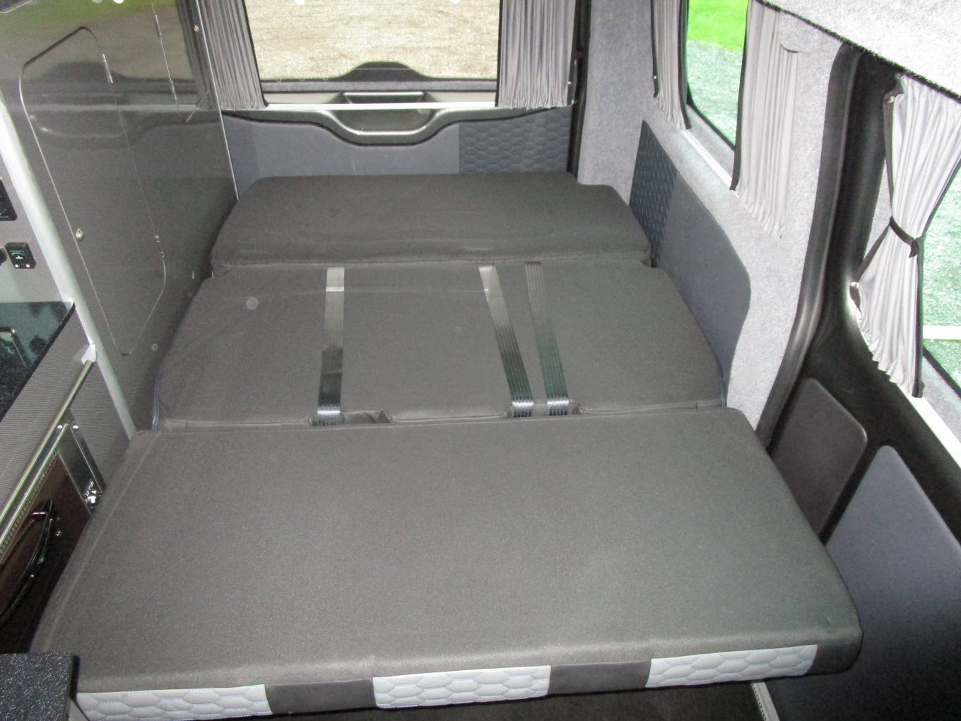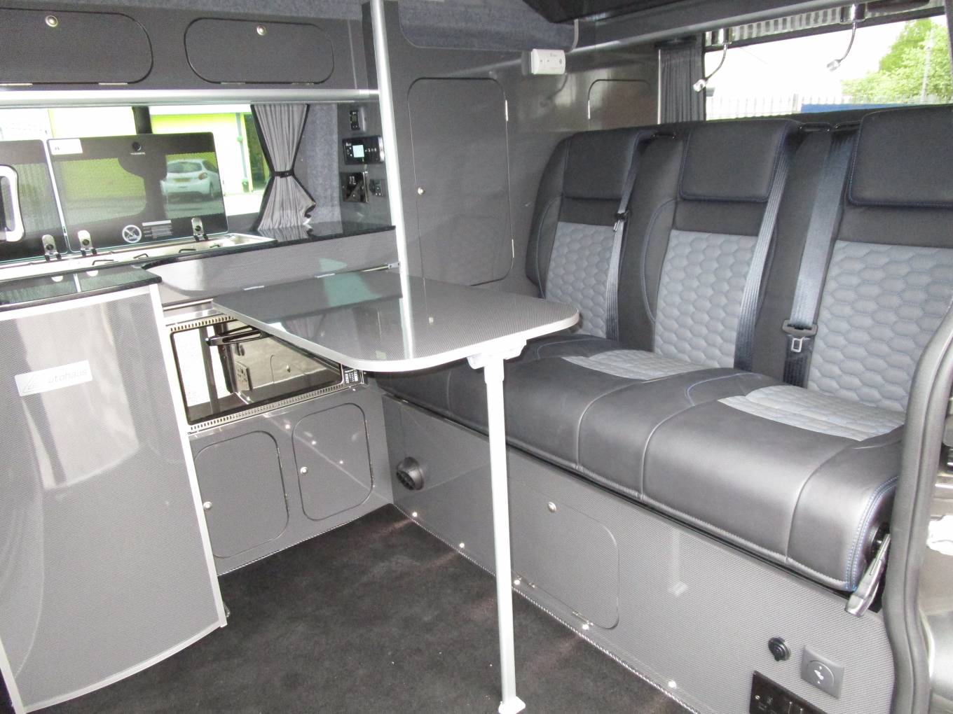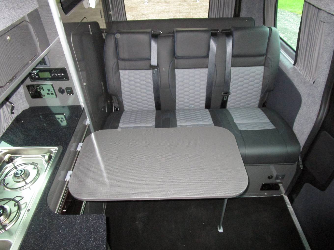 The Spartan GT is a fine looking campervan; the swish interiors have been optimised to make full use of the space available; flush fitting doors, a combination twin hob and sink, 50ltr fridge-freezer, pull-down dining table, and a curved fridge door with storage pockets. The front elevating roof increases the headroom and can be used for an optional roof bed.