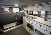 inside and at the rear of the van. Attached to outside of the van is an awning