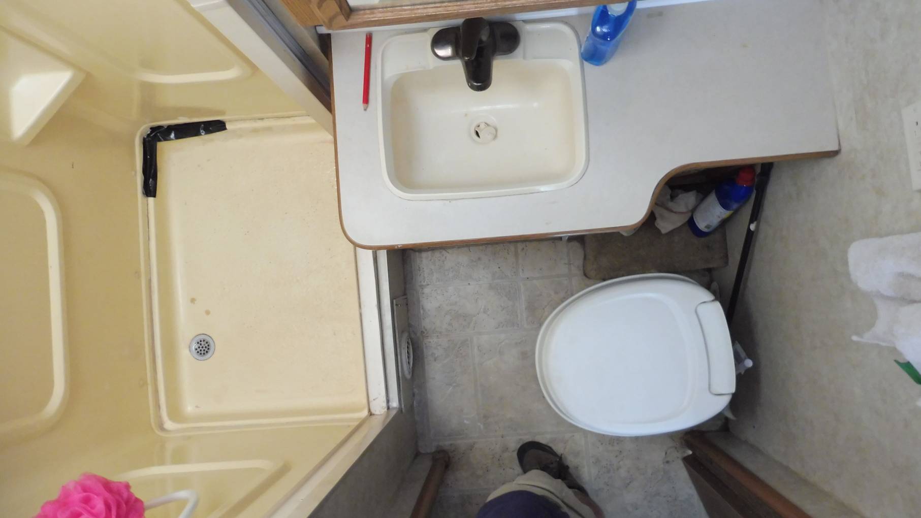 vanity sink unit, shower and toilet connected to the black waste tank.