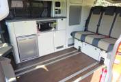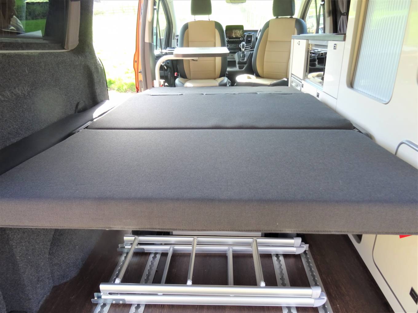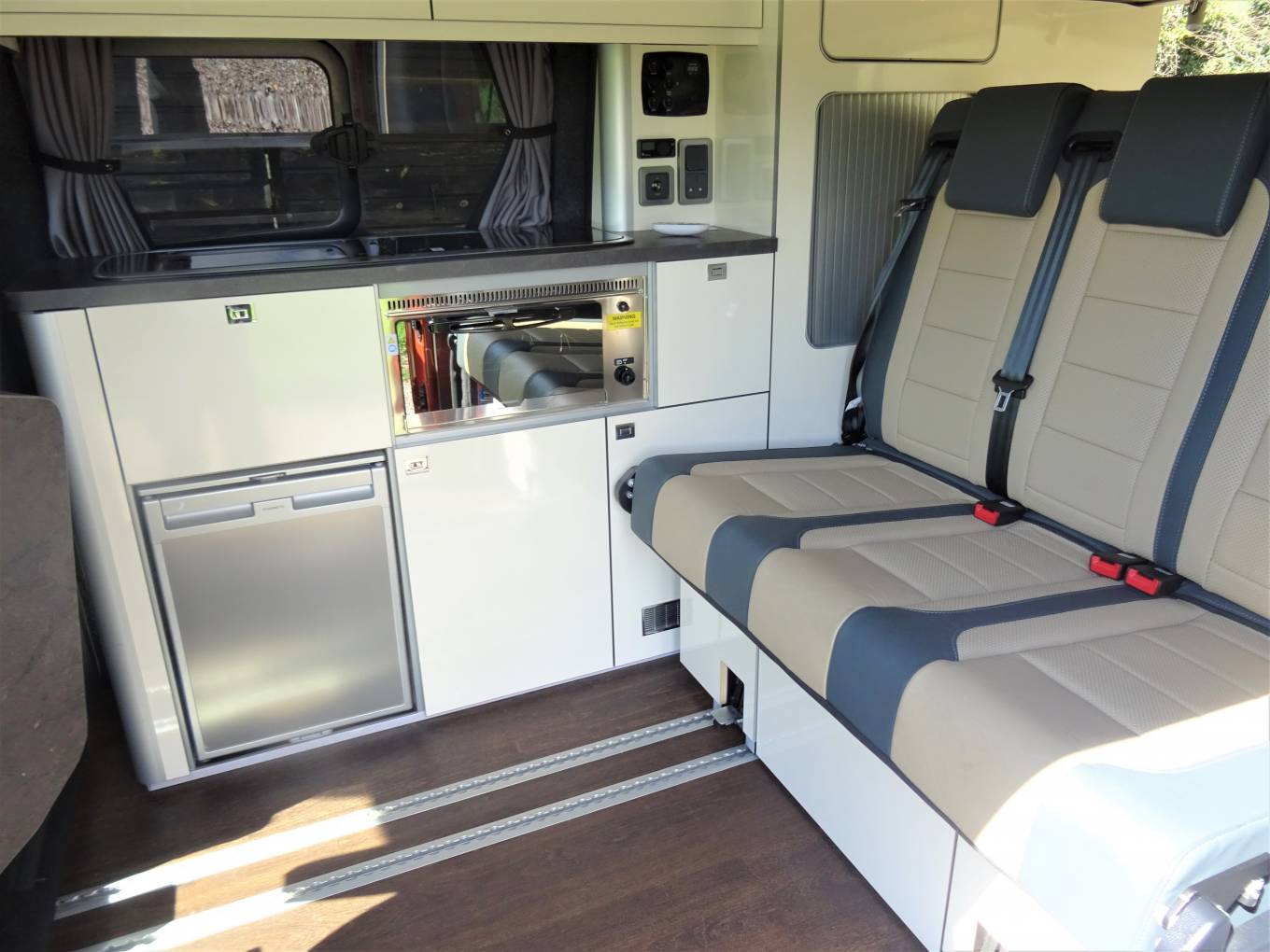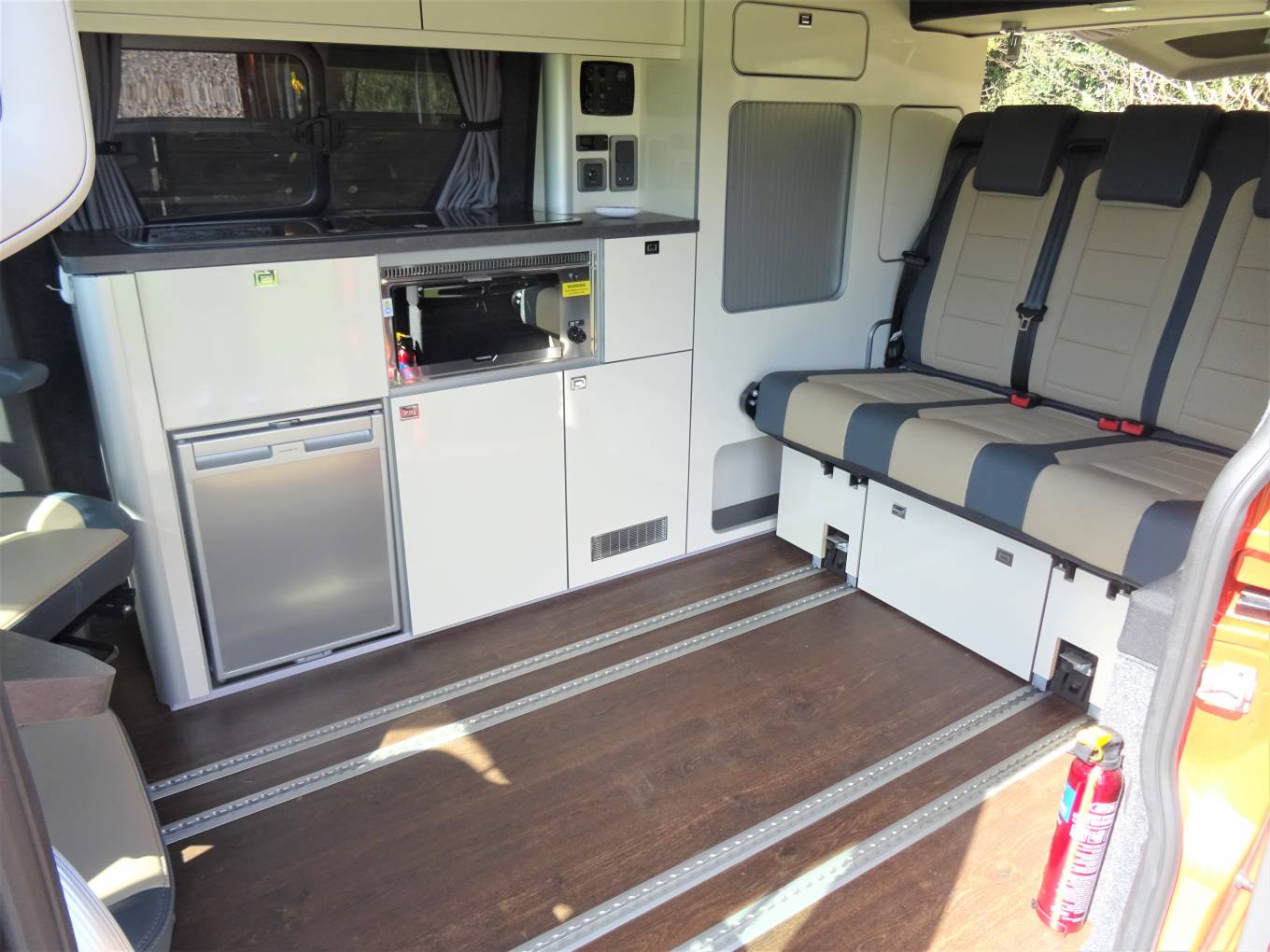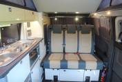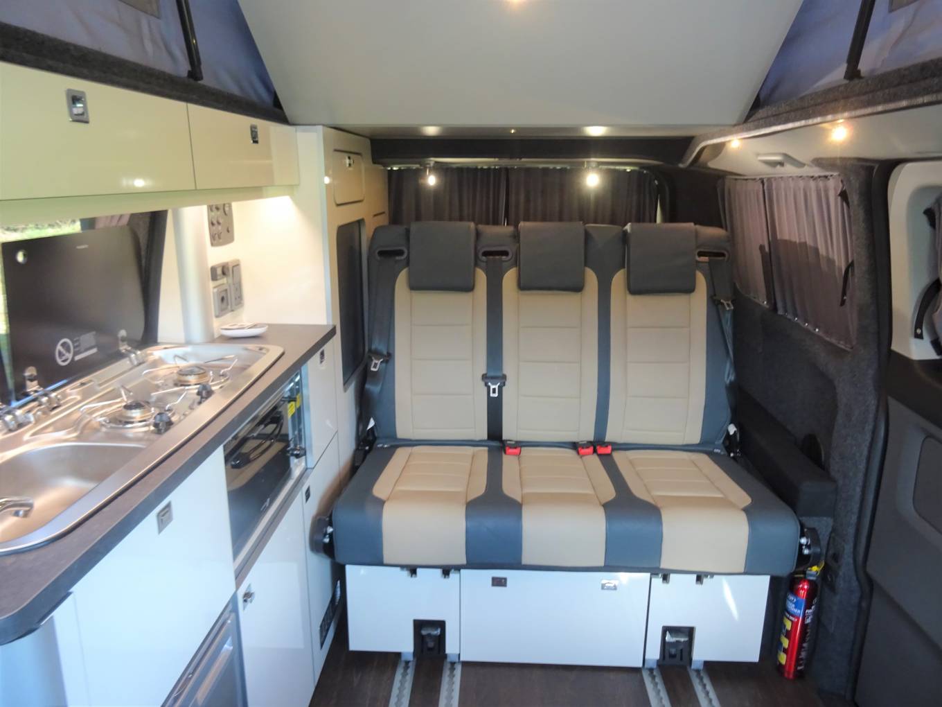 The sliding rear seats allow you to maximize lounge space and rear load space as well making for versatility uncommon in most campers. Both cab seats swivel easily, we have 2 tables, the kitchen has lots of storage with large soft close drawer, cupboards, 40 litre fridge, 2 gas burner hob, Smev mini grill (upgrade) sink and tap. There are 2 overhead lockers, 1 at the rear, a tambour door locker and under seat storage. There is an A class style - all in one service cupboard. The upholstery is the full leather upgrade and the seats easily convert for a double bed (6ft 3" x 4ft 2"). The heating is Eberspacher blown air system. The Pop Top easily pushes up to make our 4 Berth and there is a ladder up. Lighting is excellent upstairs and down with LED's, spots and dimmable remote controlled strip lights with USB points. Natural light in the Pop Top comes by way of 3 zipped windows. The Camper has a rear tail gate with dual slide doors for through ventilation and fitted throughout with black out curtains. There is a built in safe.