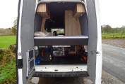 To the right the kitchen is equipped the oven and grill, 3 way fridge, 2 gas ring hob, sink and plenty of storage to the sides the rear and front. At the back of the vehicle you have the transverse double bed just under 6 feet long in length.